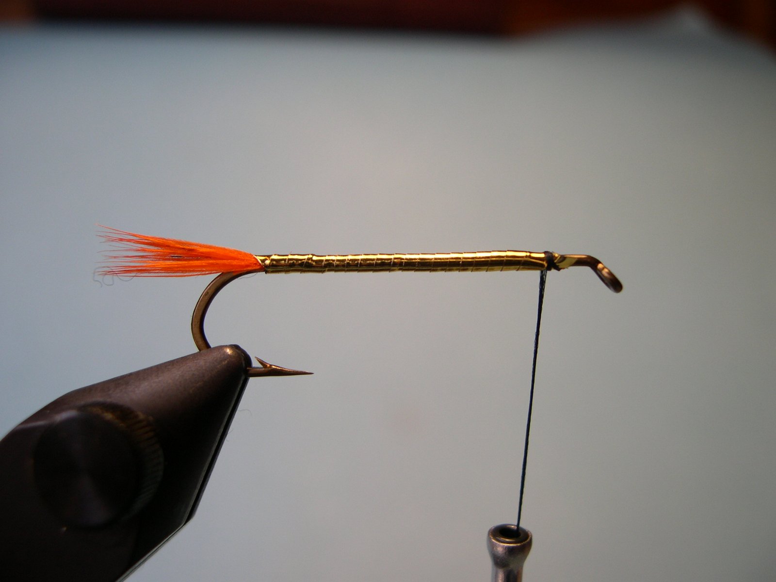 Enroscar el tinsel dorado a lo largo de la pata del anzuelo conformando así el cuerpo de la mosca.