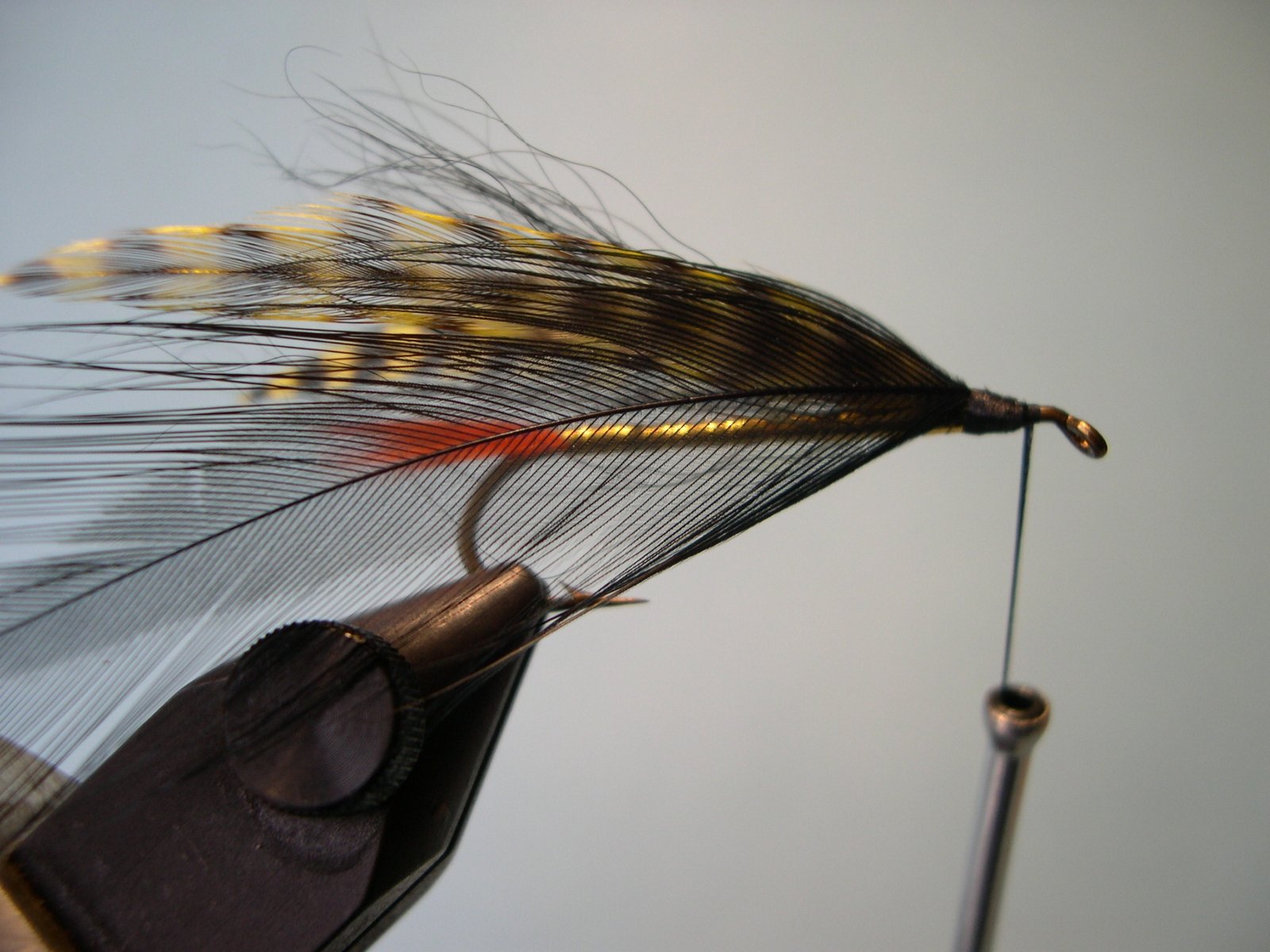 Atar una pluma de cogote de gallo negra por su base en el punto donde nace el ala.