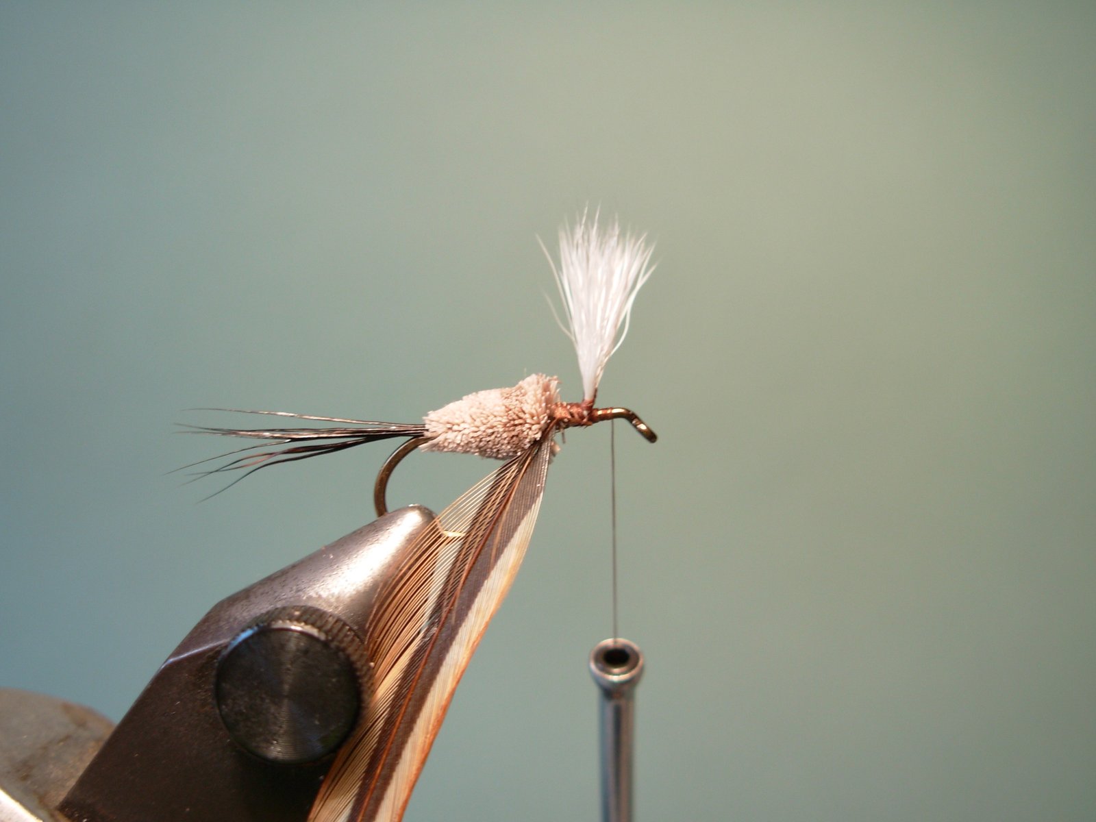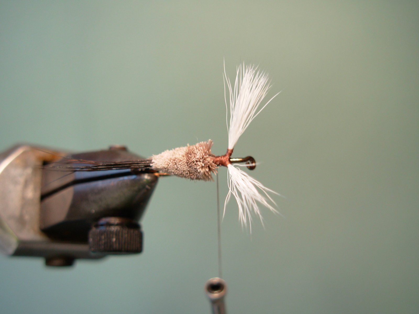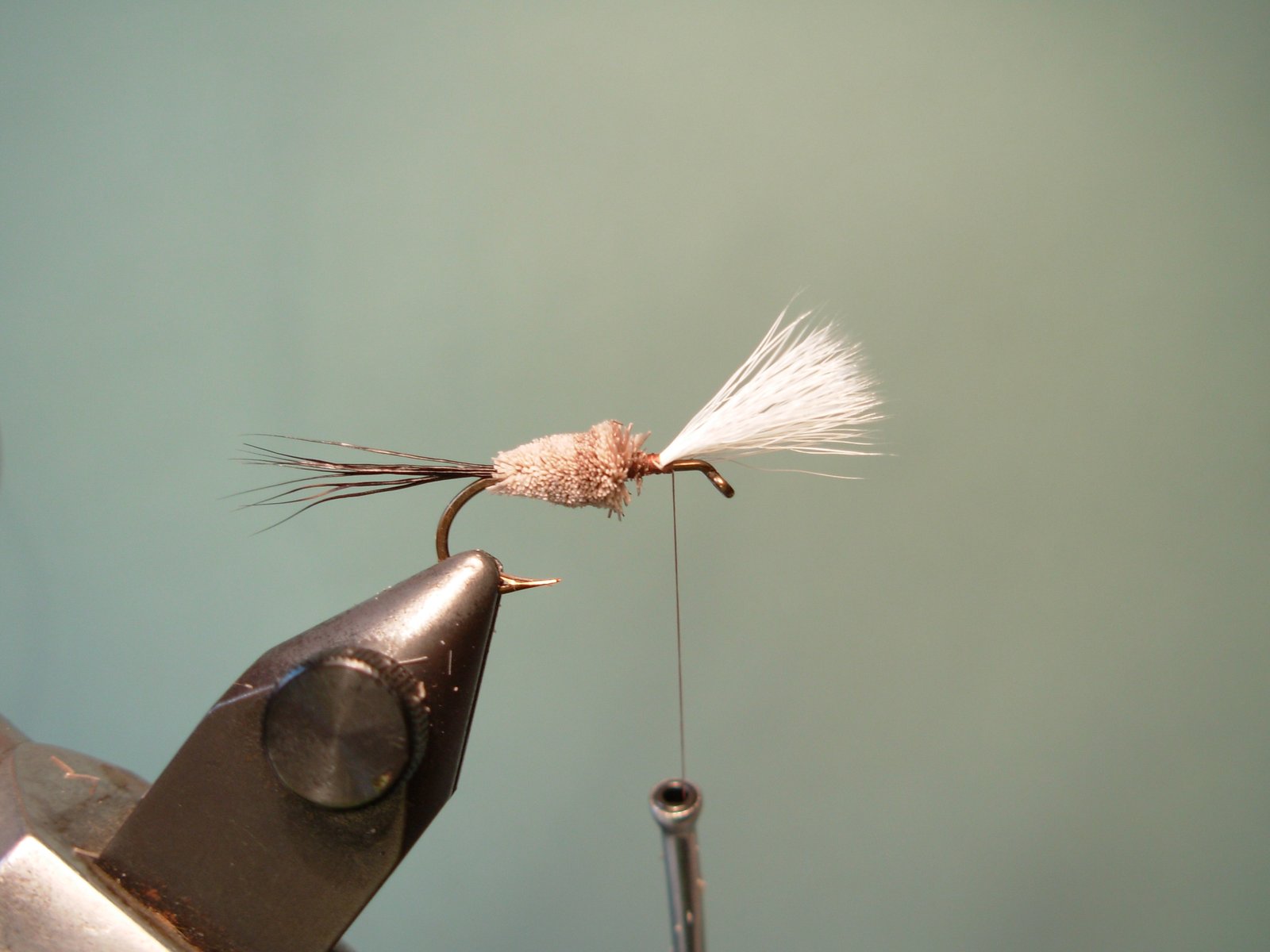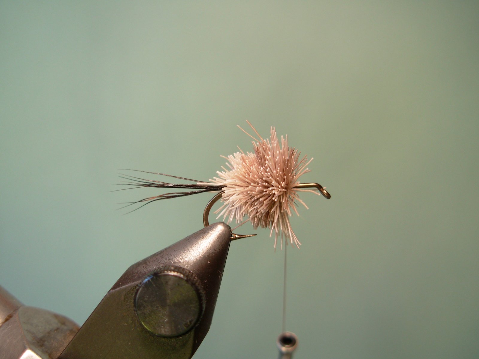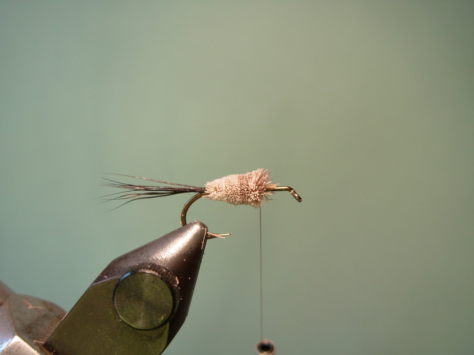Atar un mechón de pelo de cuerpo de ciervo y comprimirlo en el punto donde comienza la cola de la mosca.