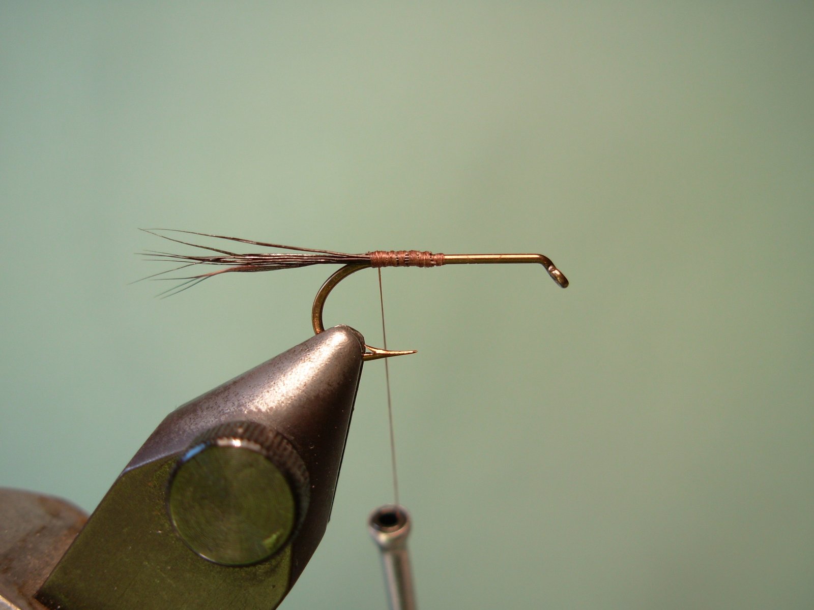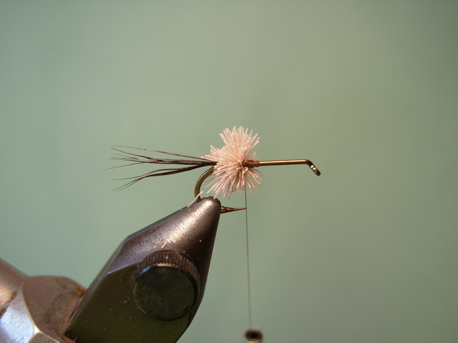 Separar en partes iguales el pelo de ternero y envolver con varias vueltas de hilo en sus bases para que queden en forma de “V” y perpendiculares a la pata del anzuelo.