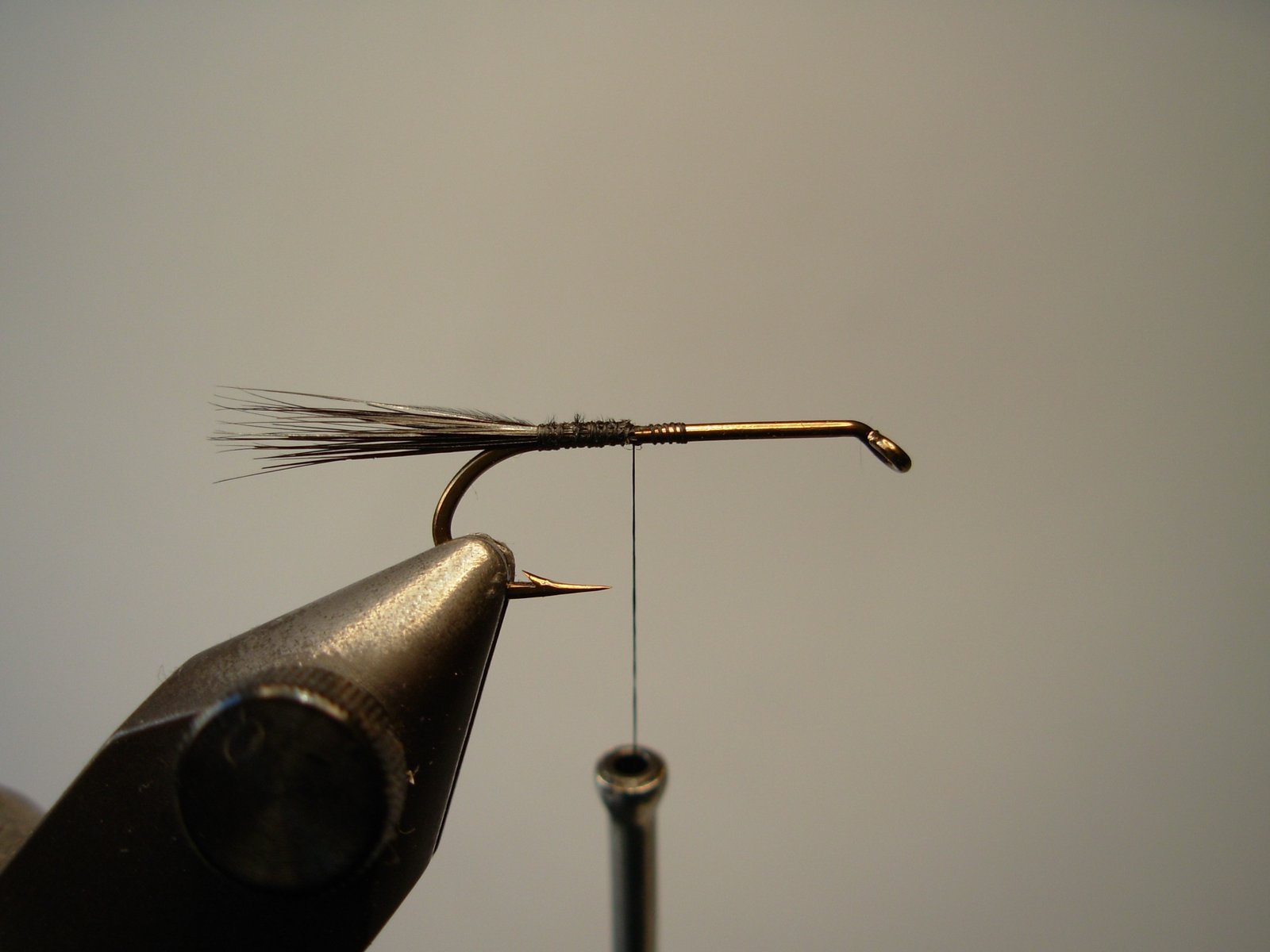 Estirar hacia delante los dos vernilles que oficiarán de caja de alas y atarlos simultáneamente junto al ojo del anzuelo, cortar el remanente y efectuar la cabeza de la mosca en ese punto.