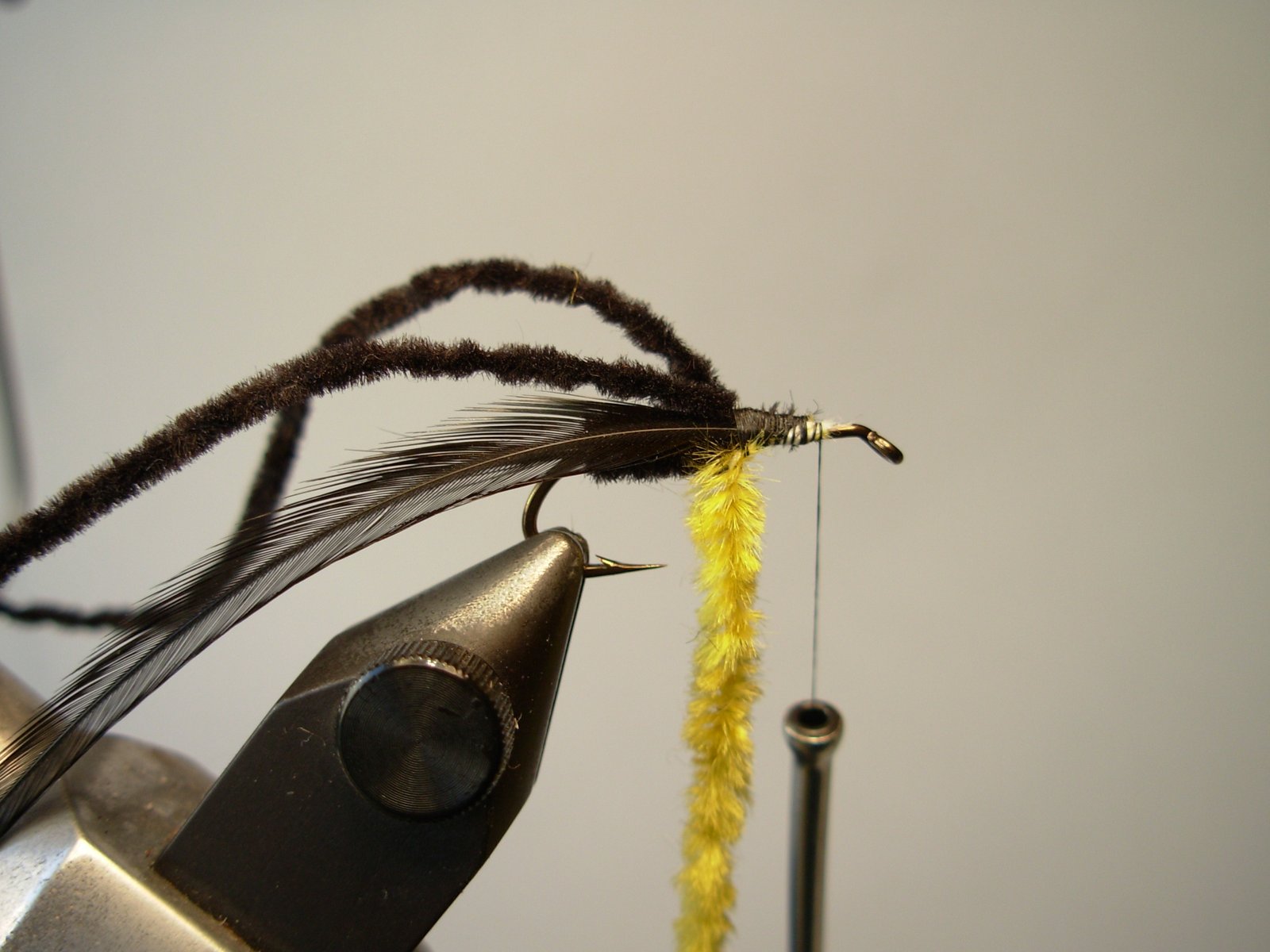 Enroscar en “palmer” sobre el chenille amarillo la pluma de gallo negra y afirmarla también “casi” junto al ojo del anzuelo.
