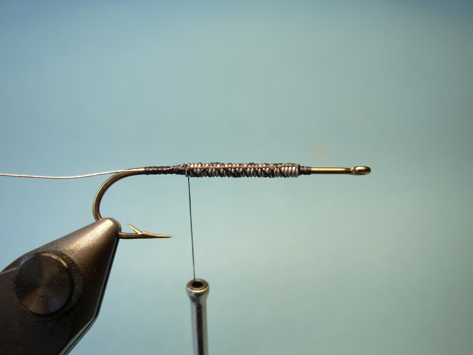 Afirmar el alambre de plomo con el hilo y atar el tinsel oval.