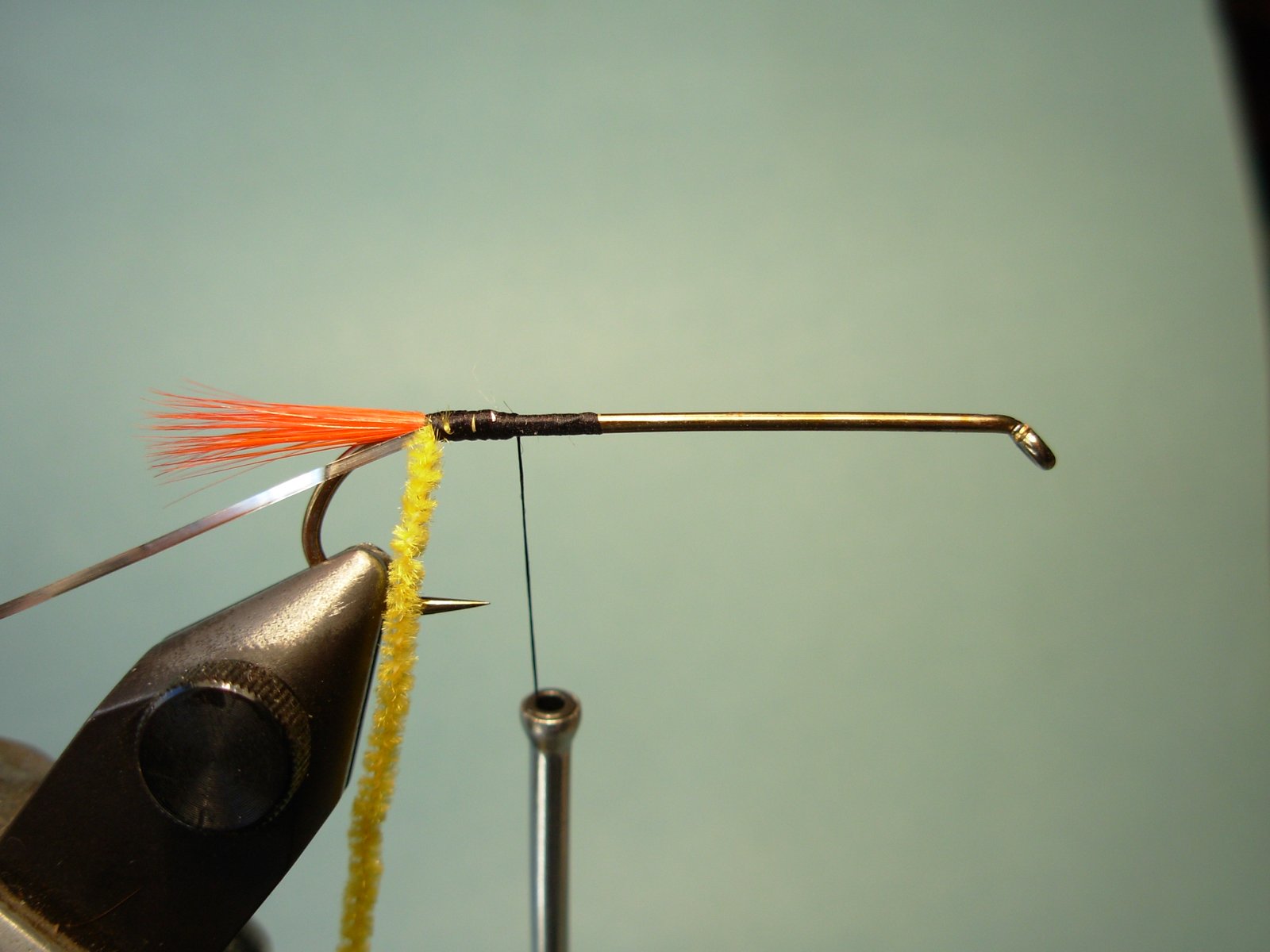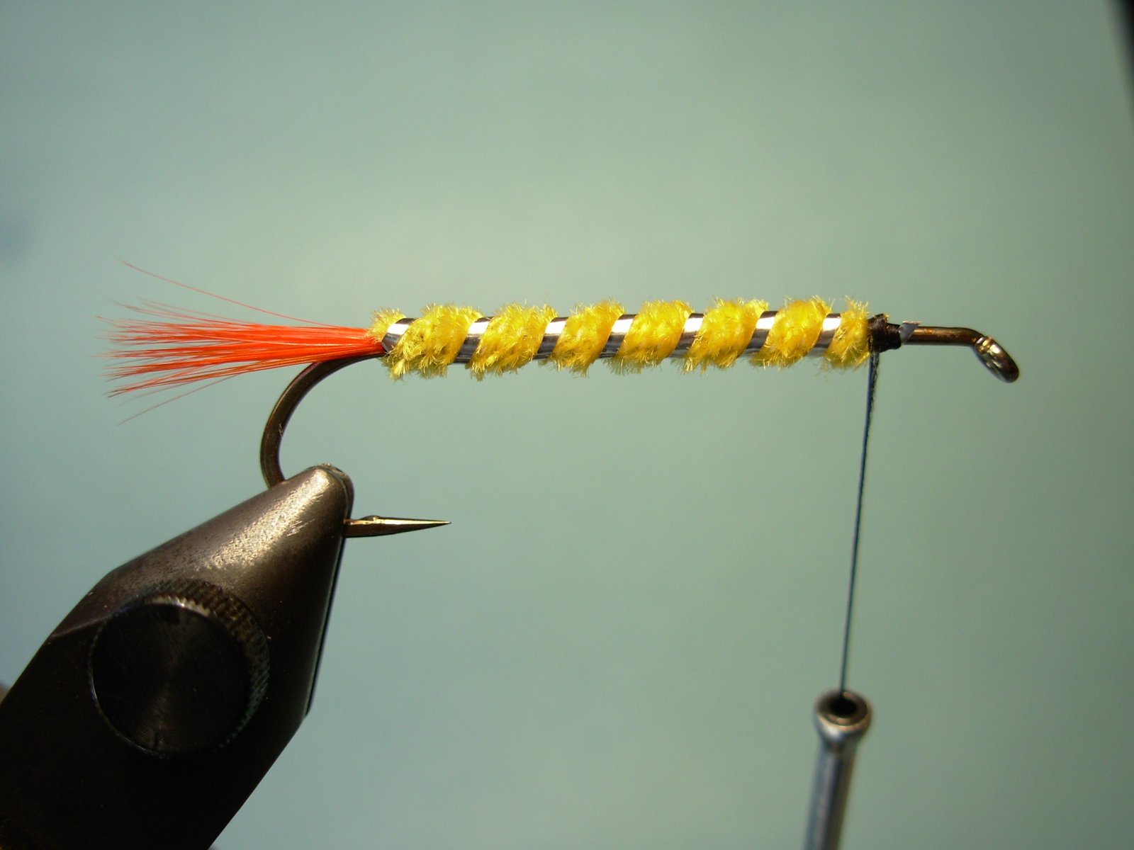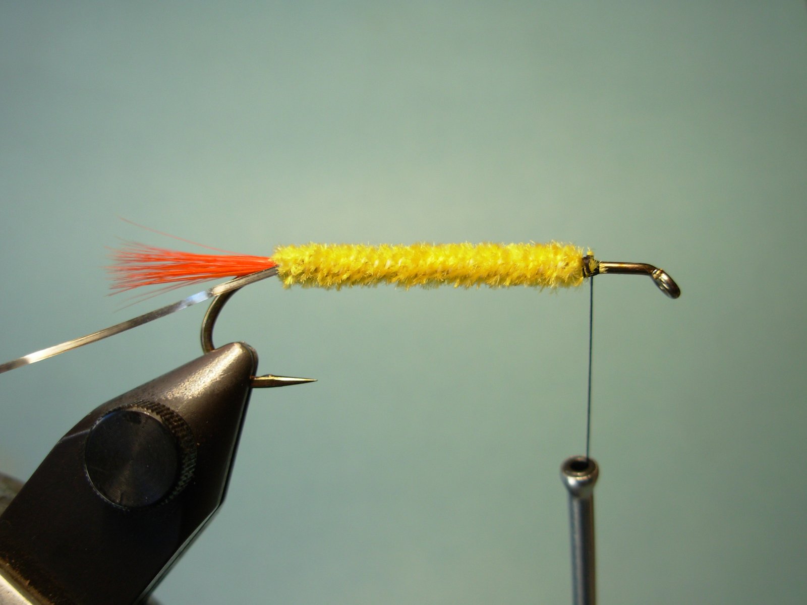 Cuerpo: Chenille fino o si lo prefiere lana o dubbing.Cola: Fibras de pluma de gallo teñidas de rojo.