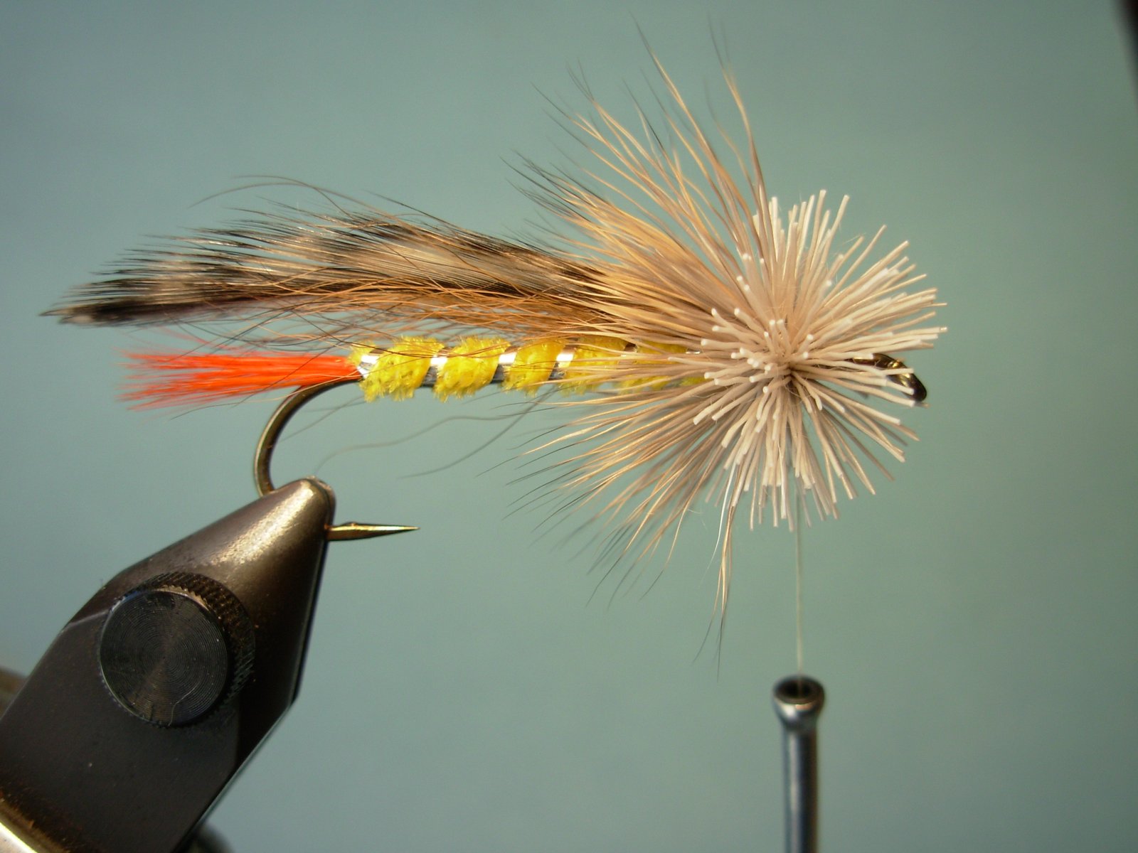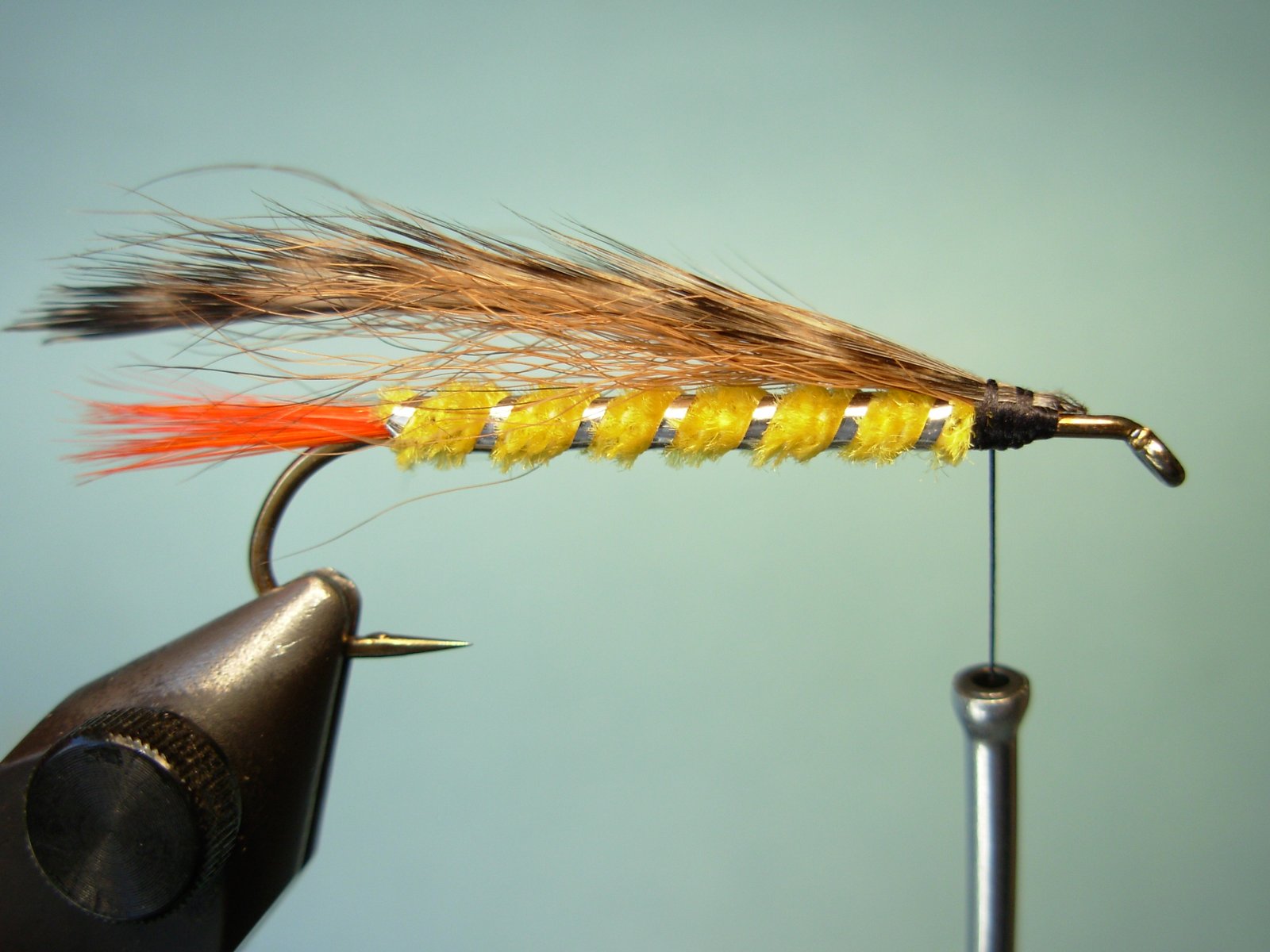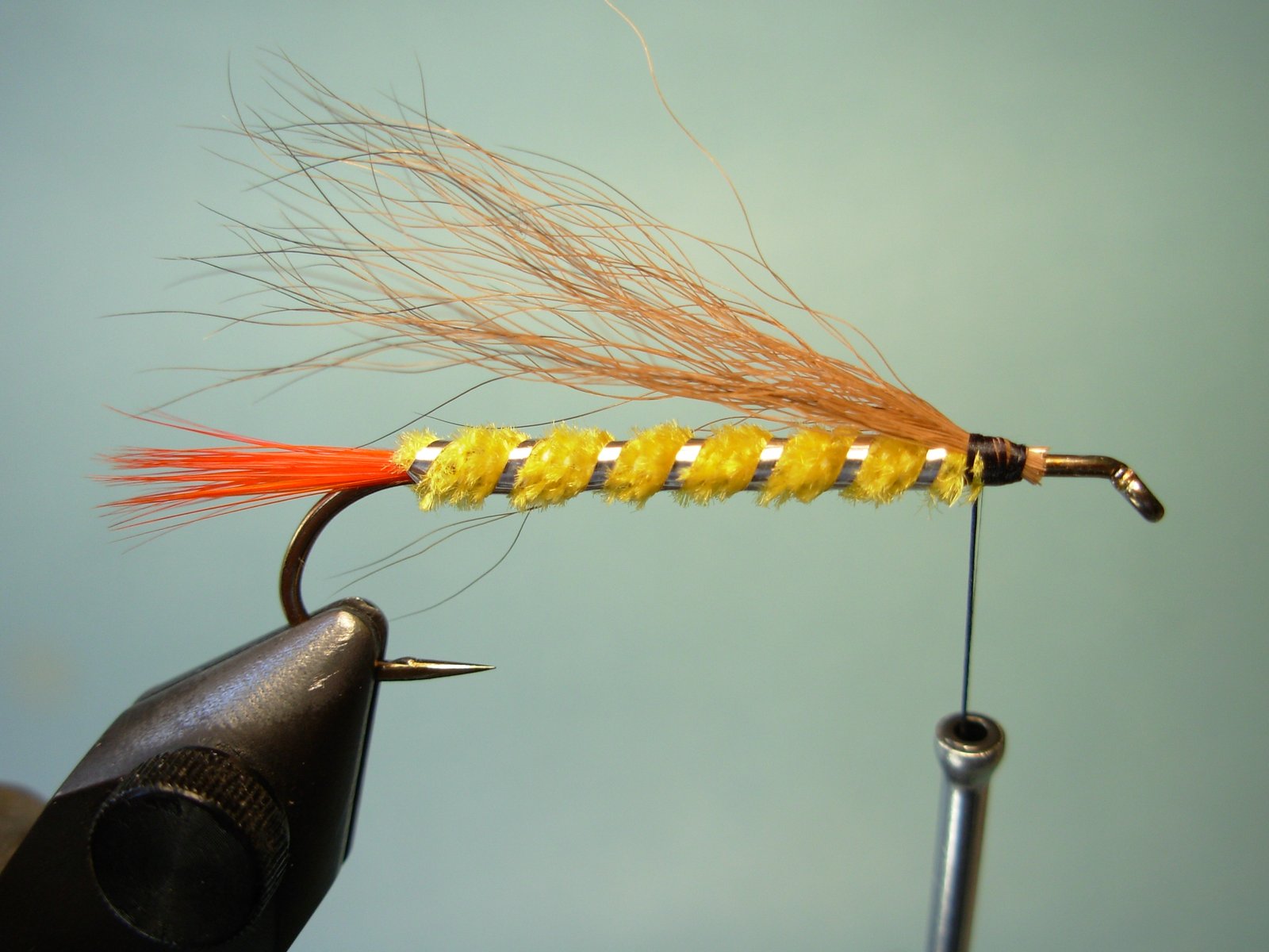 Cuerpo: Chenille fino o si lo prefiere lana o dubbing.Cola: Fibras de pluma de gallo teñidas de rojo.