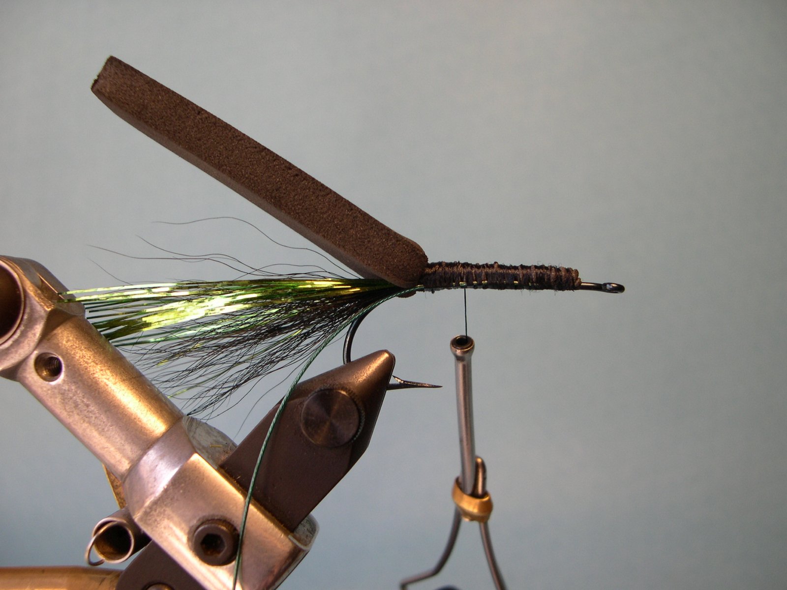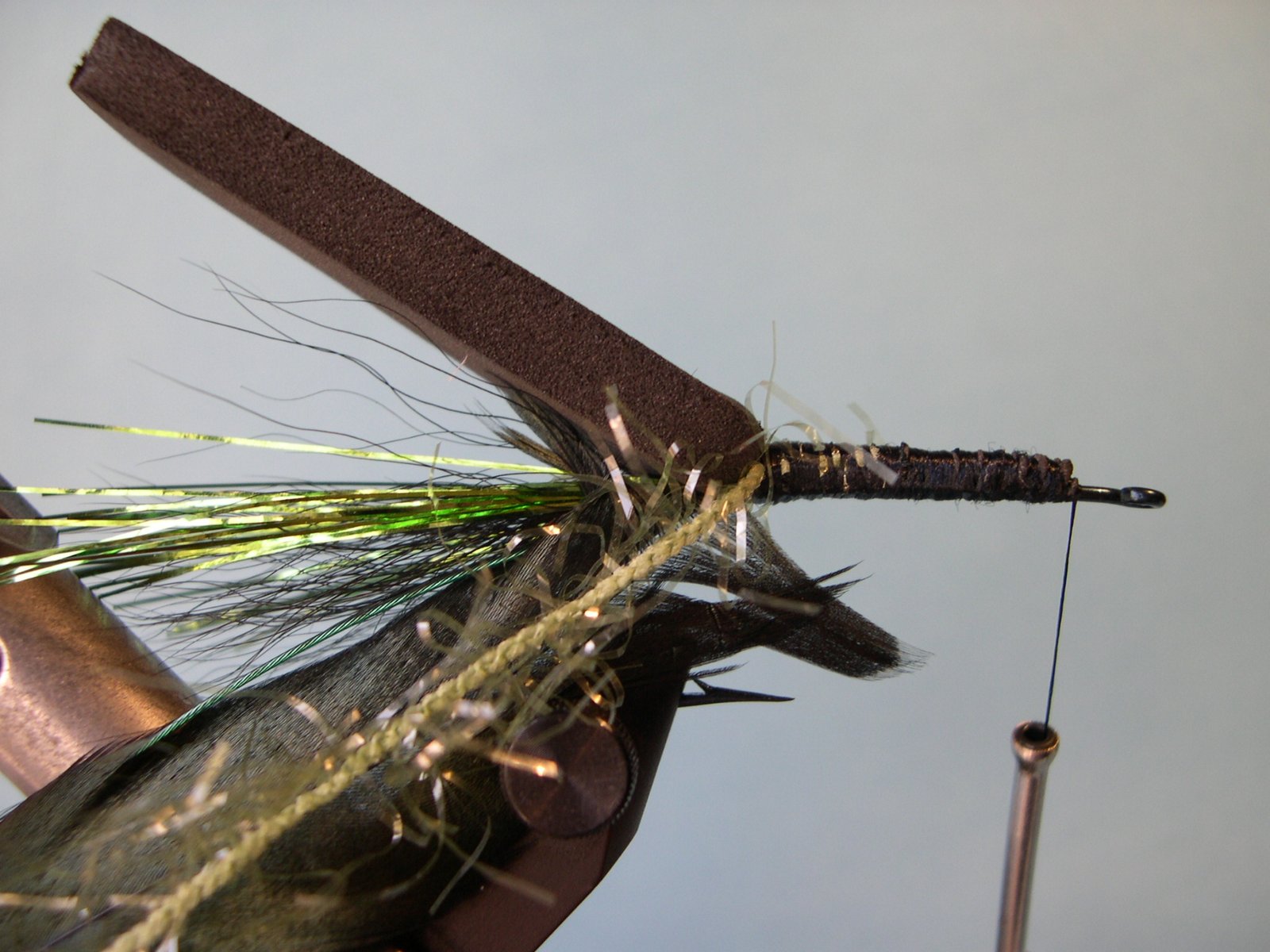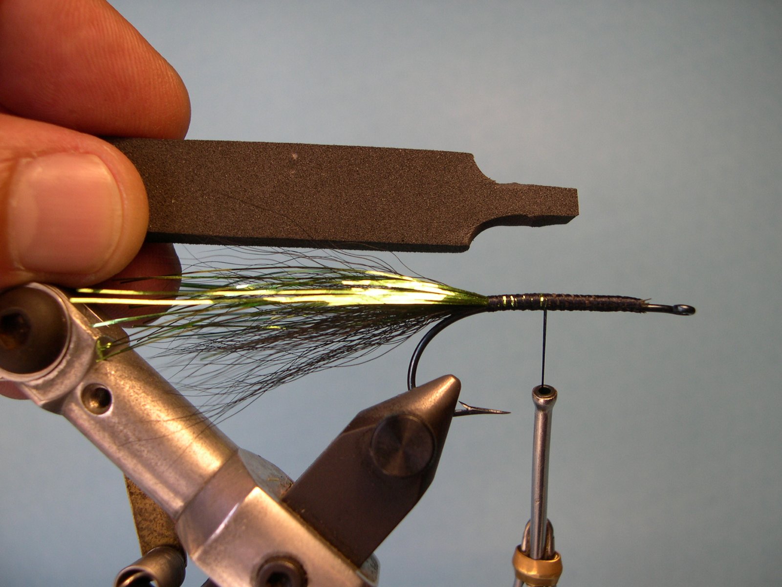 Frente: La extensión de la tira de goma eva cortada a un centímetro del ojo del anzuelo.