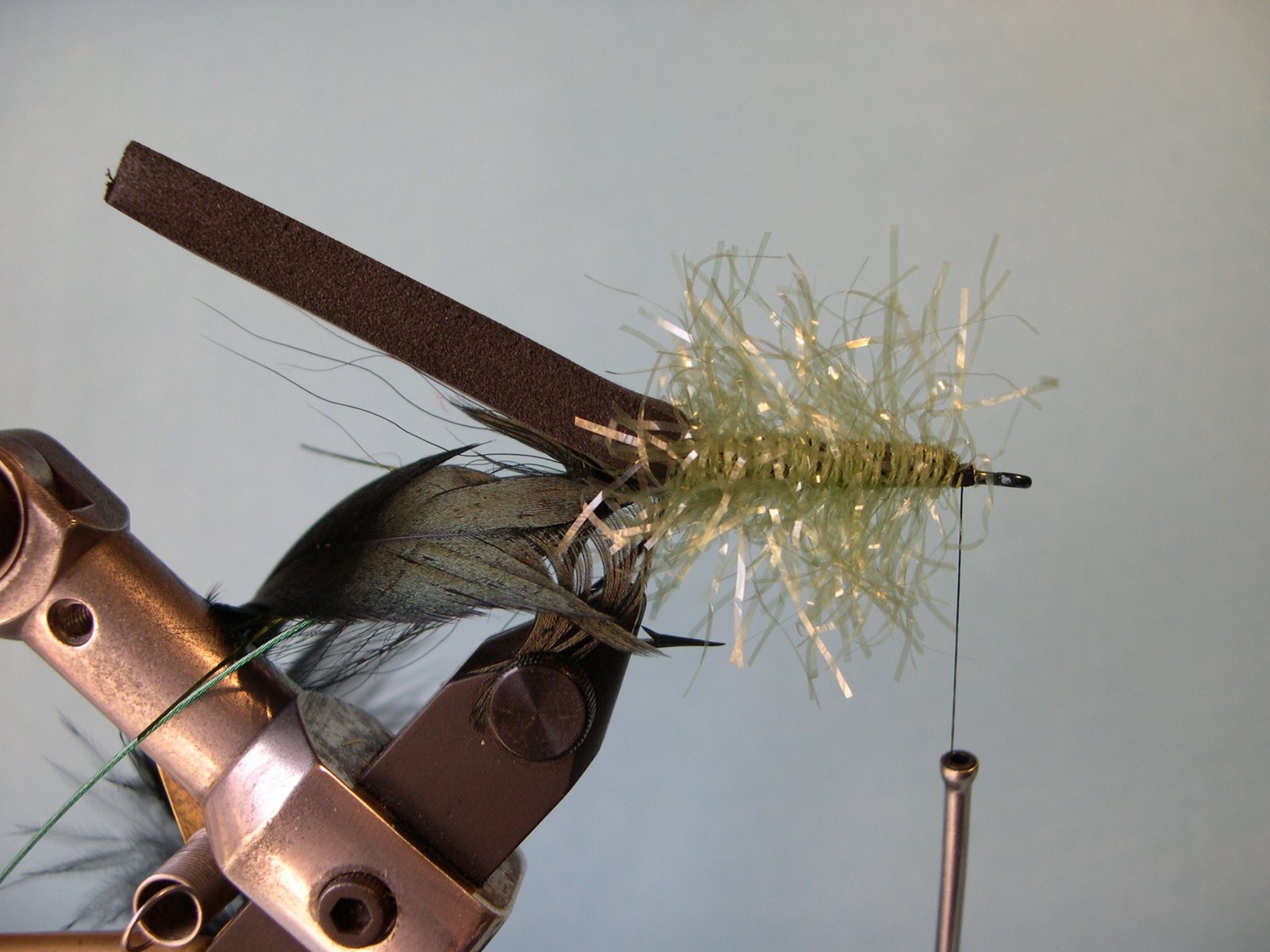 Atar algunas hebras de flashabou en ambos costados de la cola.