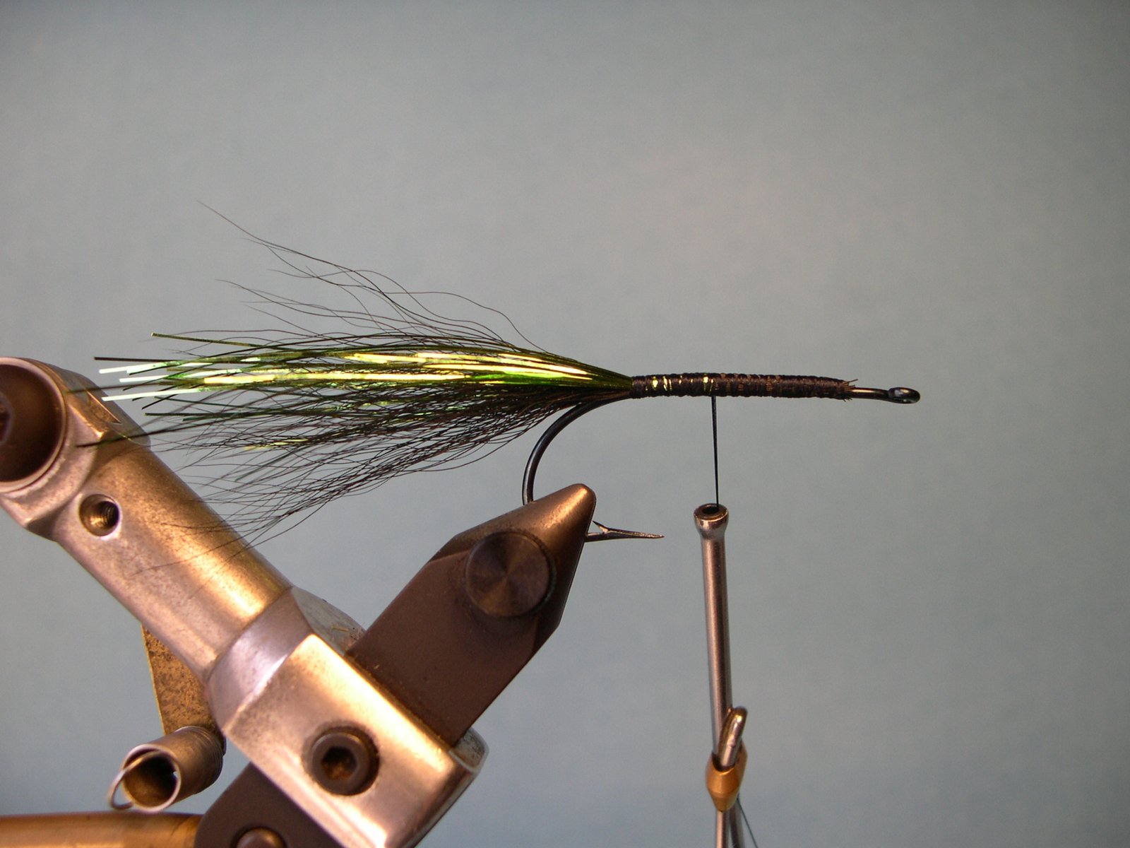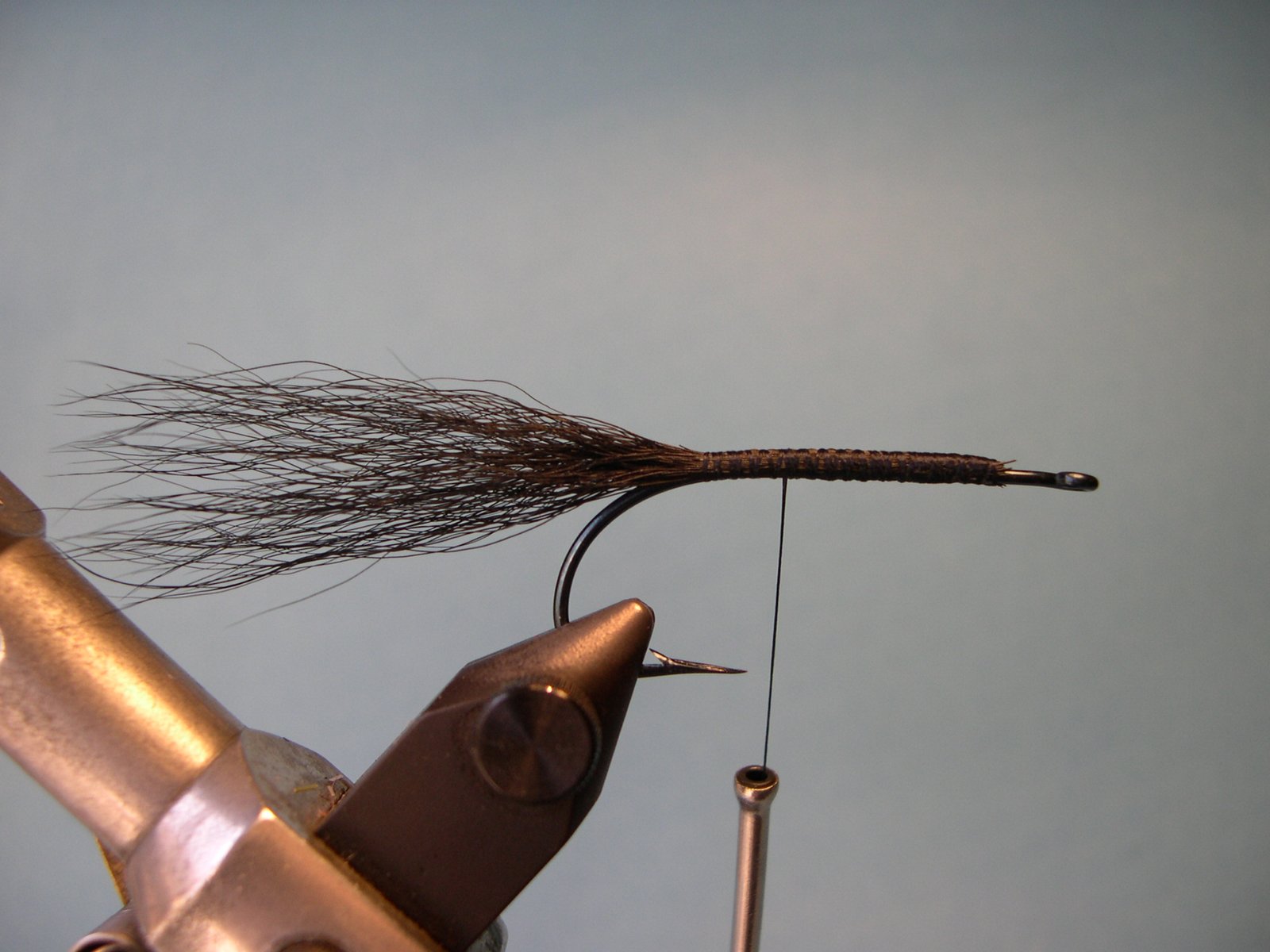 Atar a lo largo de la pata del anzuelo cable de acero (del que utilizamos para el leader) de 20 lbs. (o menos), con el que luego haremos un contraribbing para proteger el cuerpo de la mosca (recuerde que los dientes de las tarariras son muy filosos y una sola podría desarmar este cuerpo con unos pocos mordiscos).