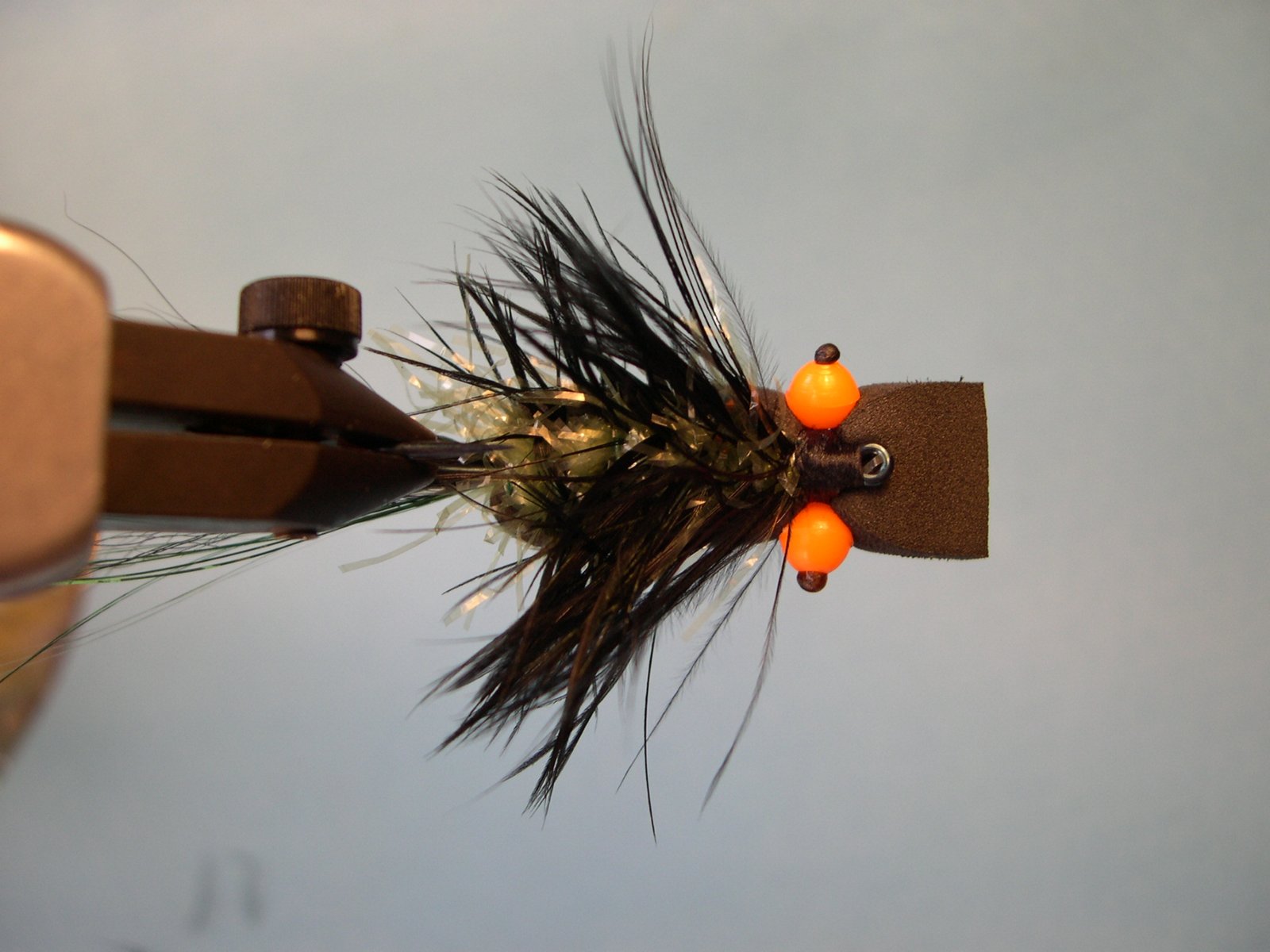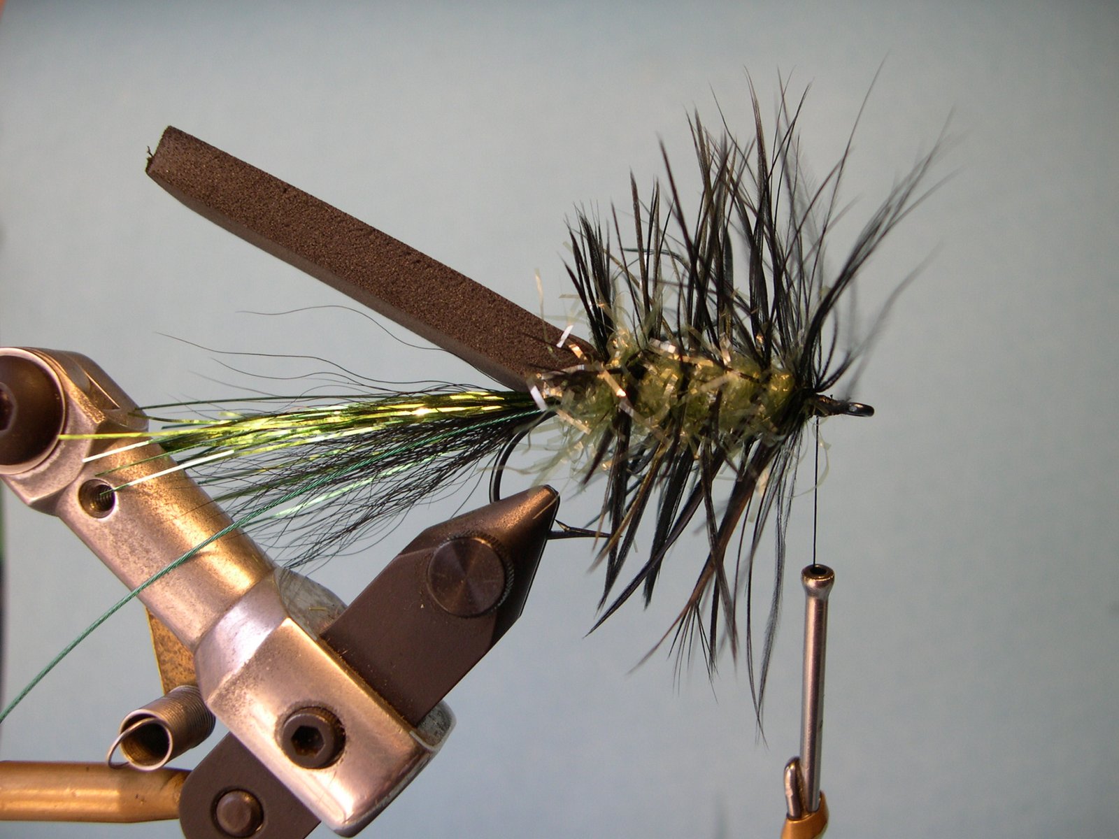 Me he tomado el atrevimiento de modificar sus proporciones para conferirle mayor flotabilidad agregándole además chenilles brillantes a su cuerpo, ojos y patas mas largas. En tamaños muy pequeños (#12 y 14) han sido vorazmente atacadas por dentudos y no dudo que deben funcionar muy bien con nuestras chanchitas de laguna.