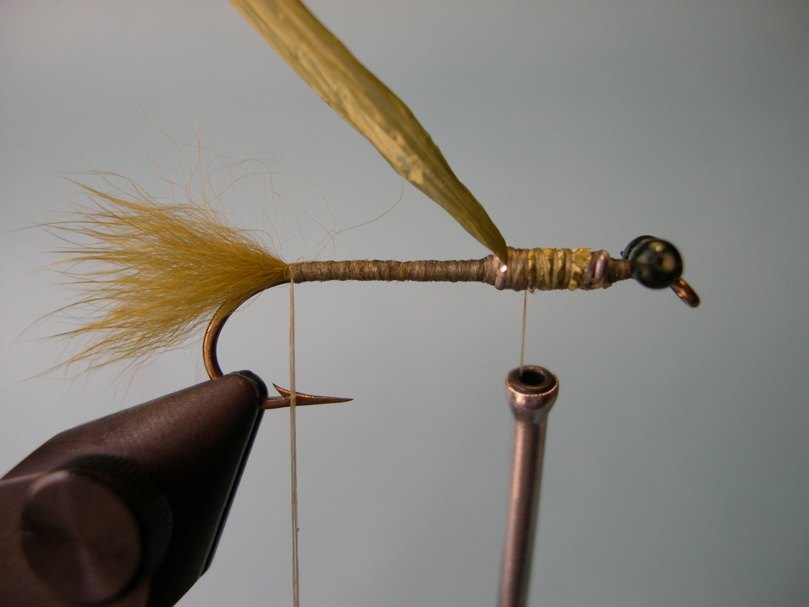 4 - Ir enroscando el hilo hacia delante y atar el Swiss Straw sobre la pata del anzuelo a un tercio de la pata cerca del ojo.