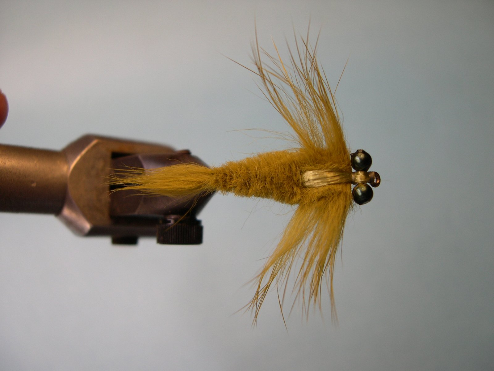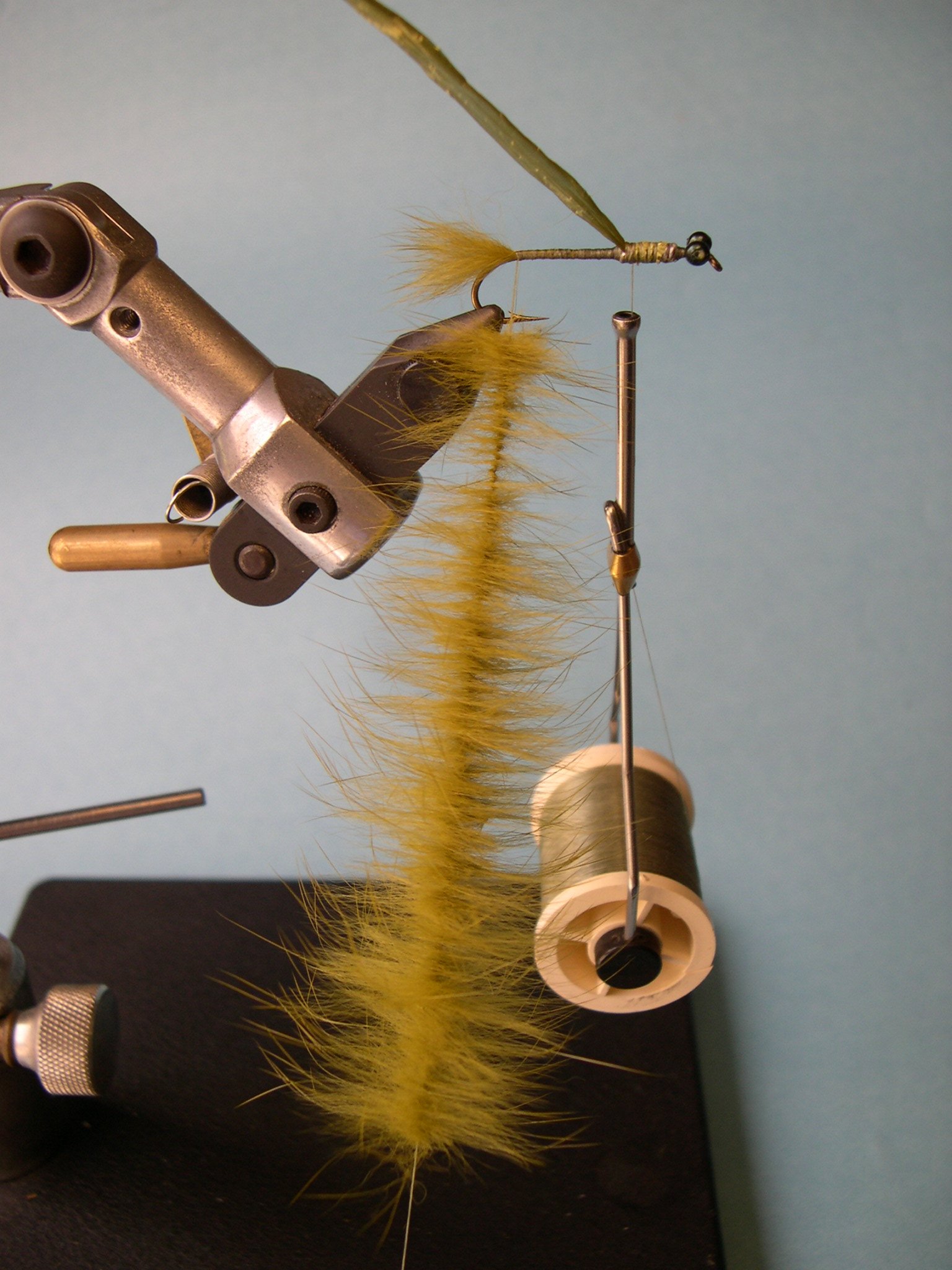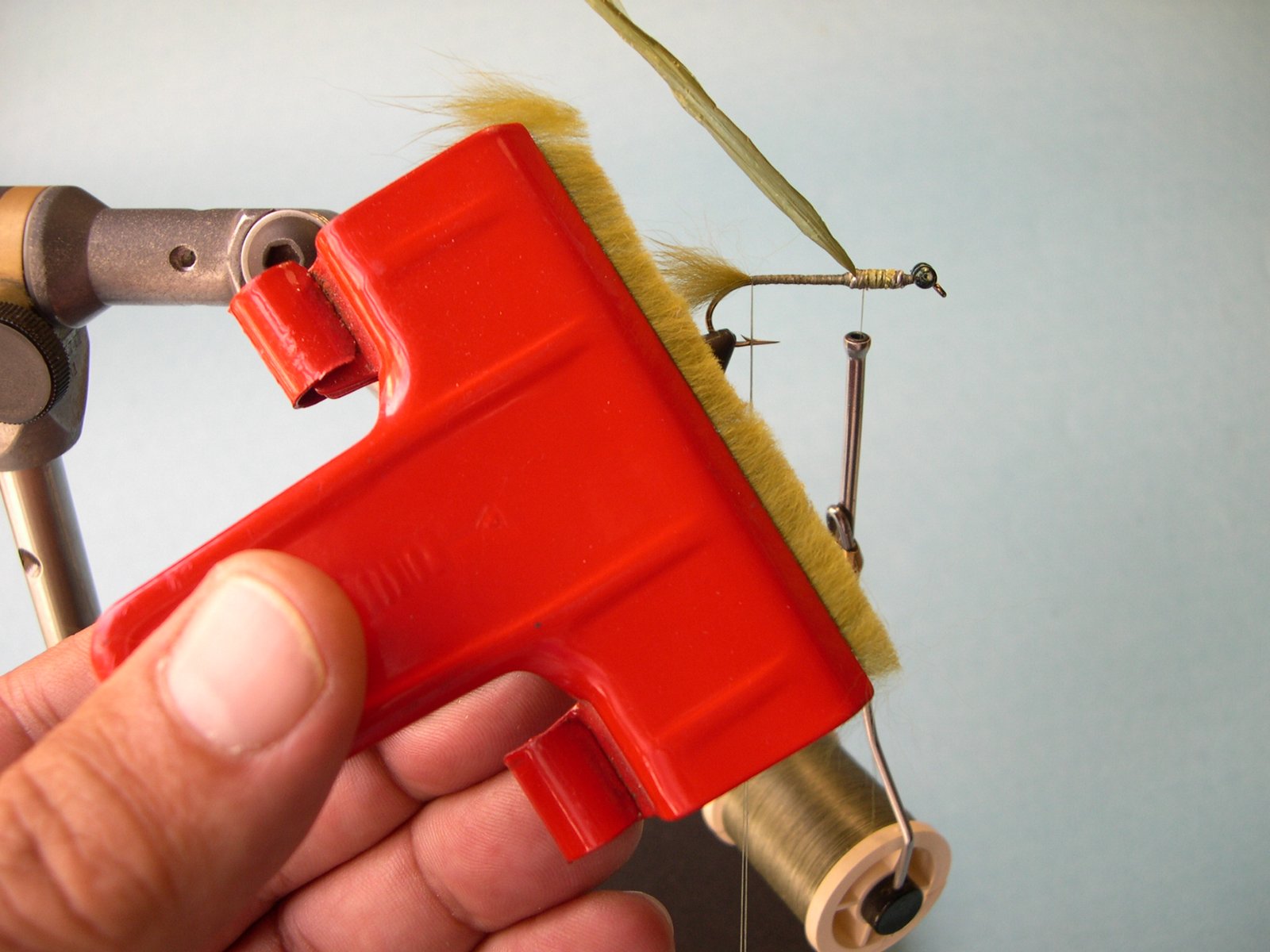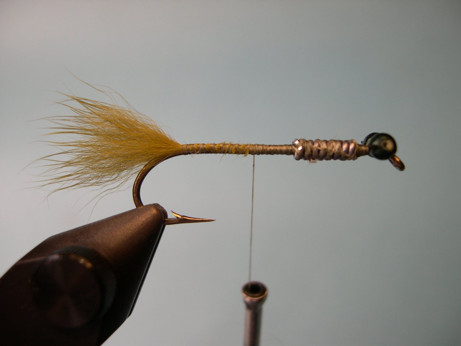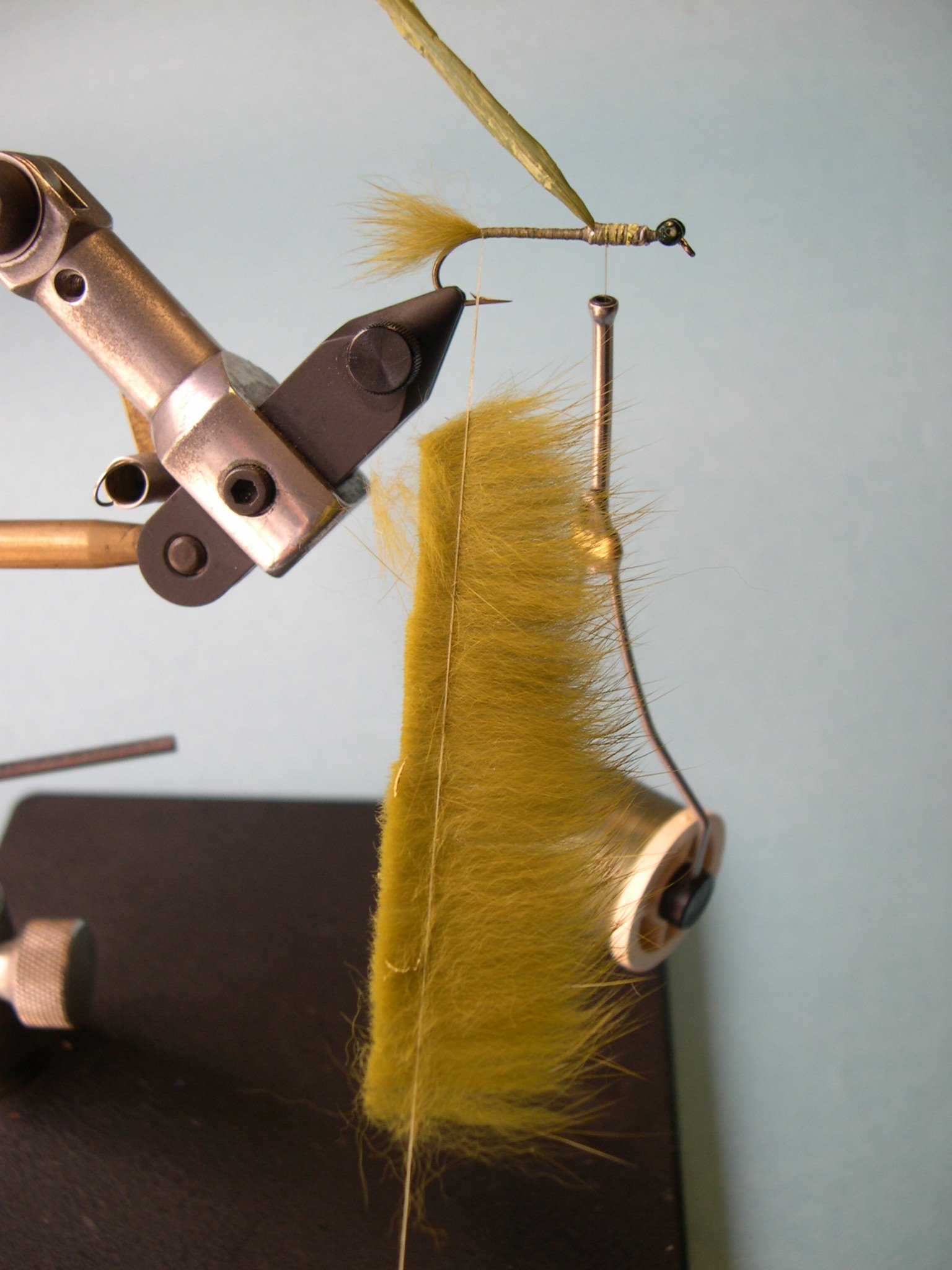 8 – Hecho esto, enroscar los pelos a lo largo de la pata del anzuelo hasta llegar a los ojos.