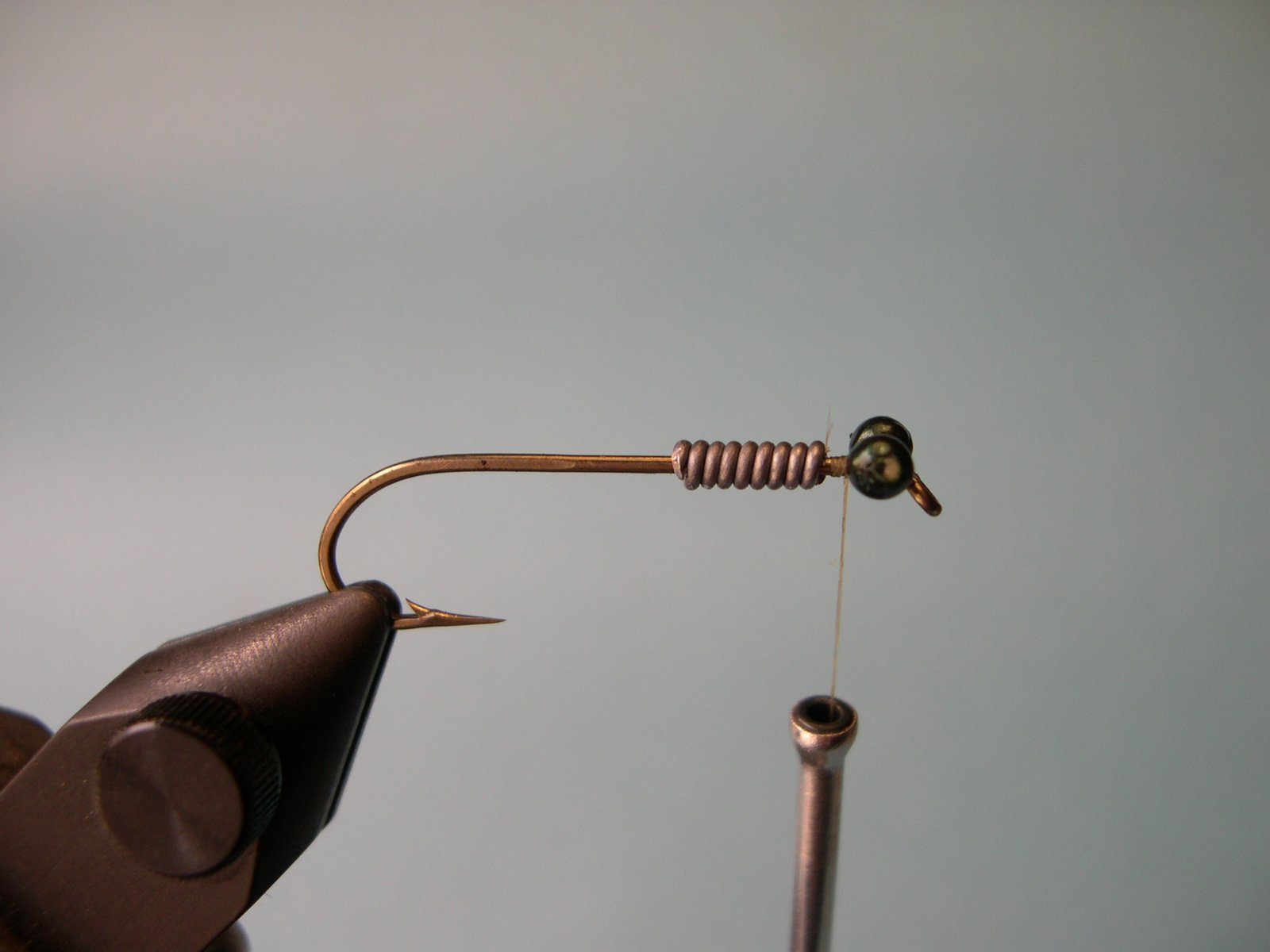 1 - Enroscar el alambre de plomo y atar los ojos junto al ojo del anzuelo.