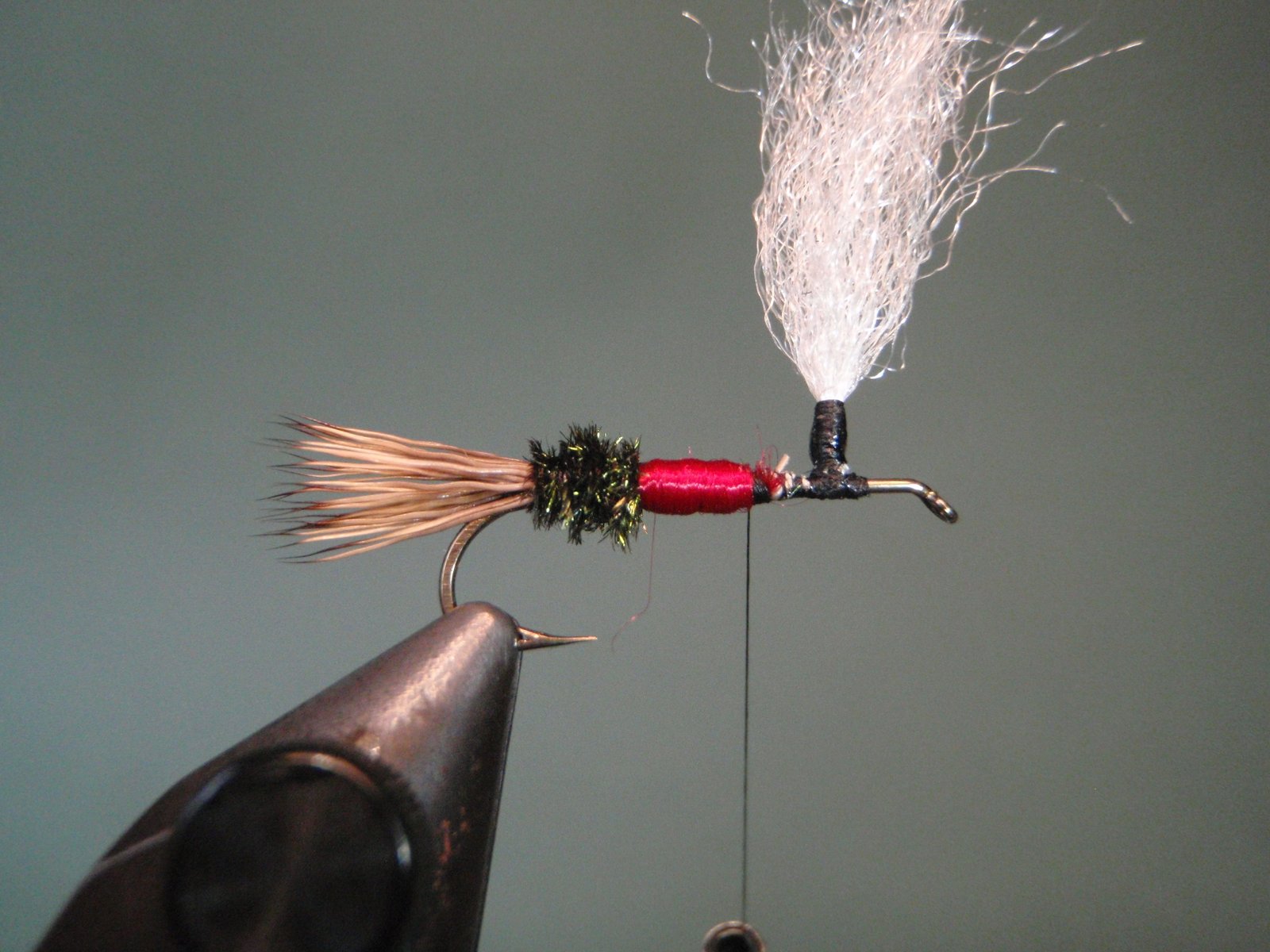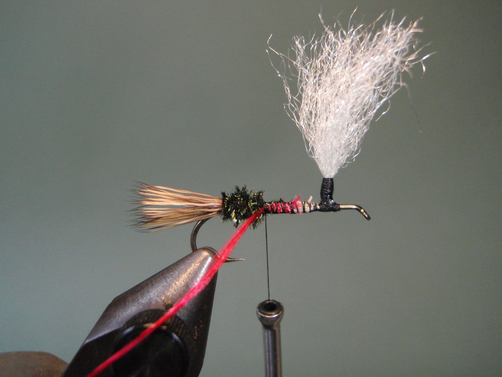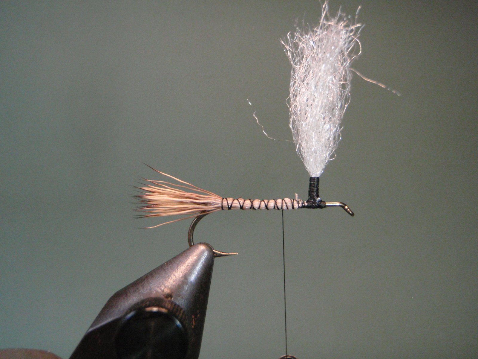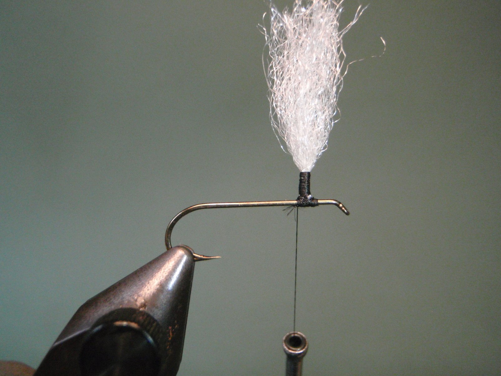 Atar un mechón de pelo de ternero blanco o material sintético (ej.: Z-lon), que servirá luego para enroscar en su base la pluma en estilo parachute y que nos permitirá visualizar mejor la mosca cuando la estemos usando.