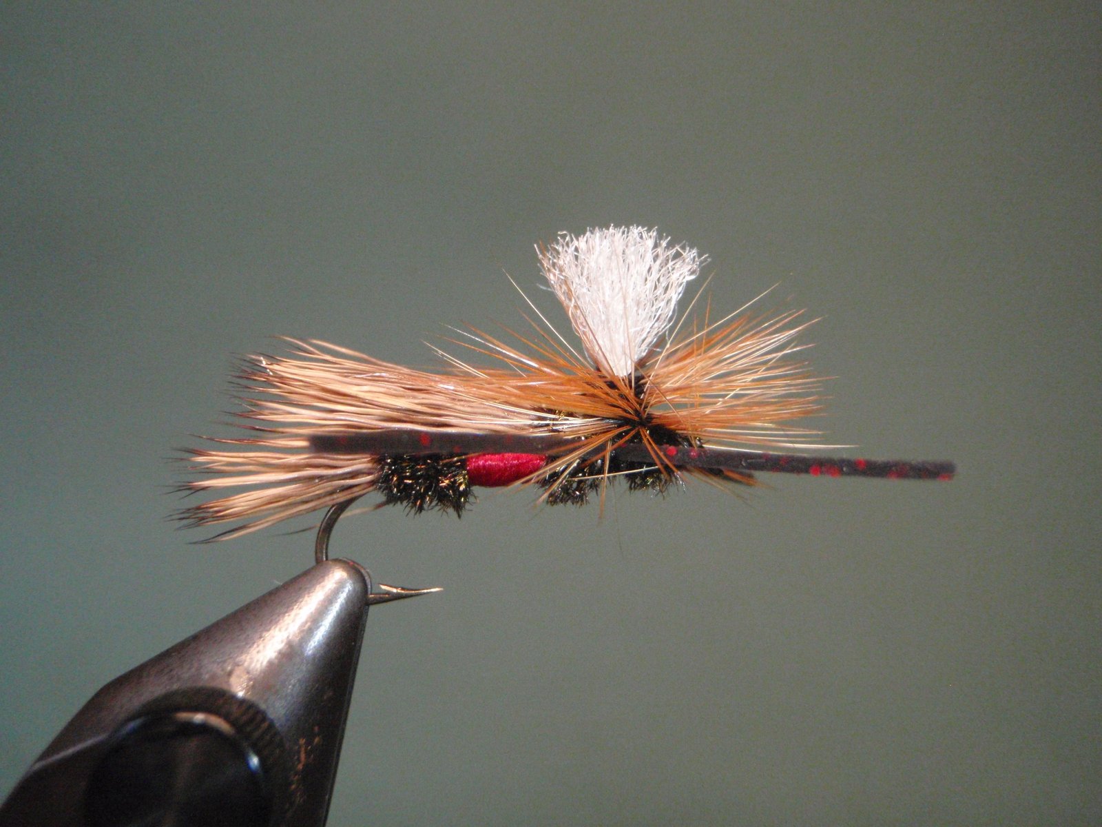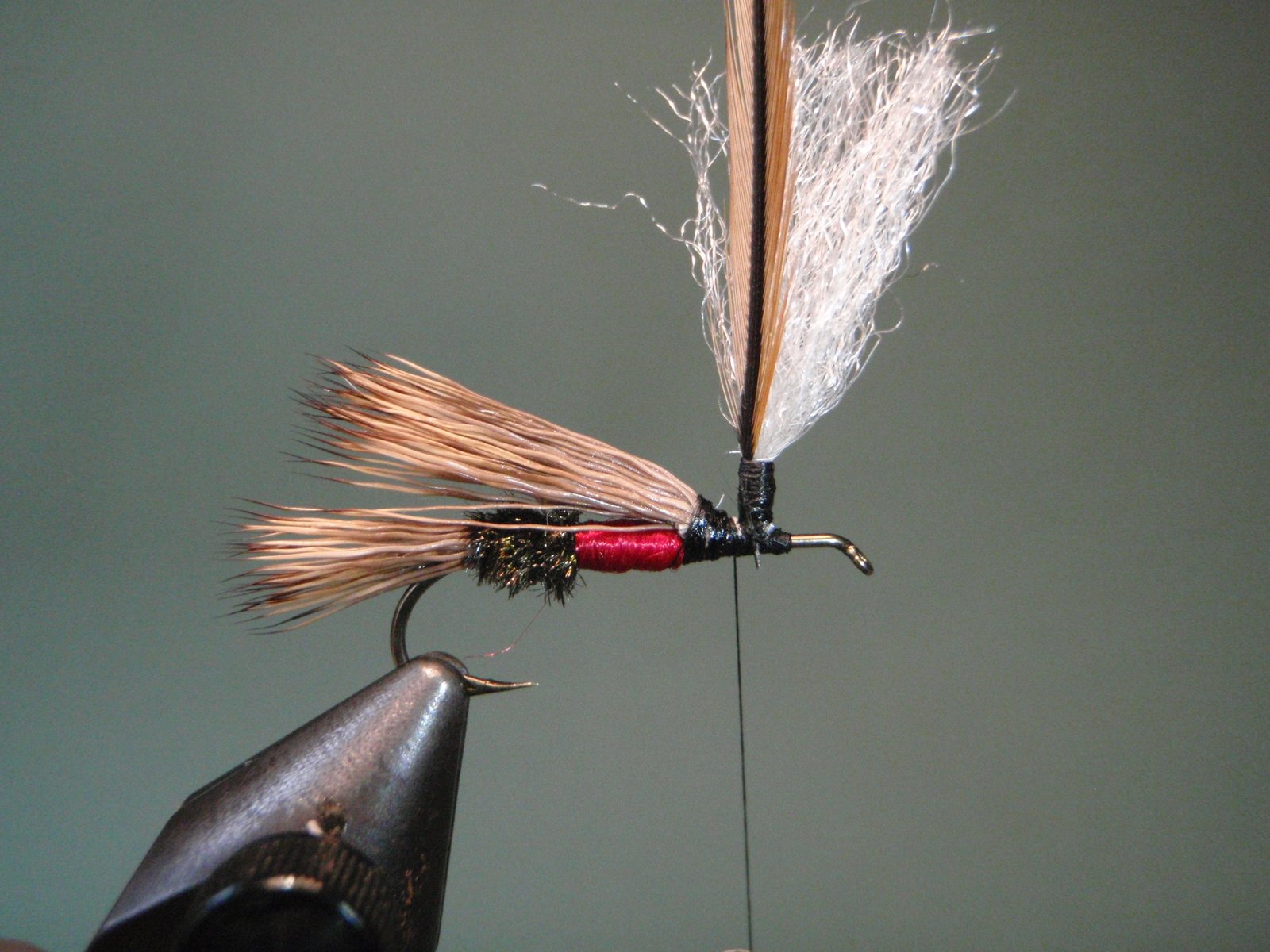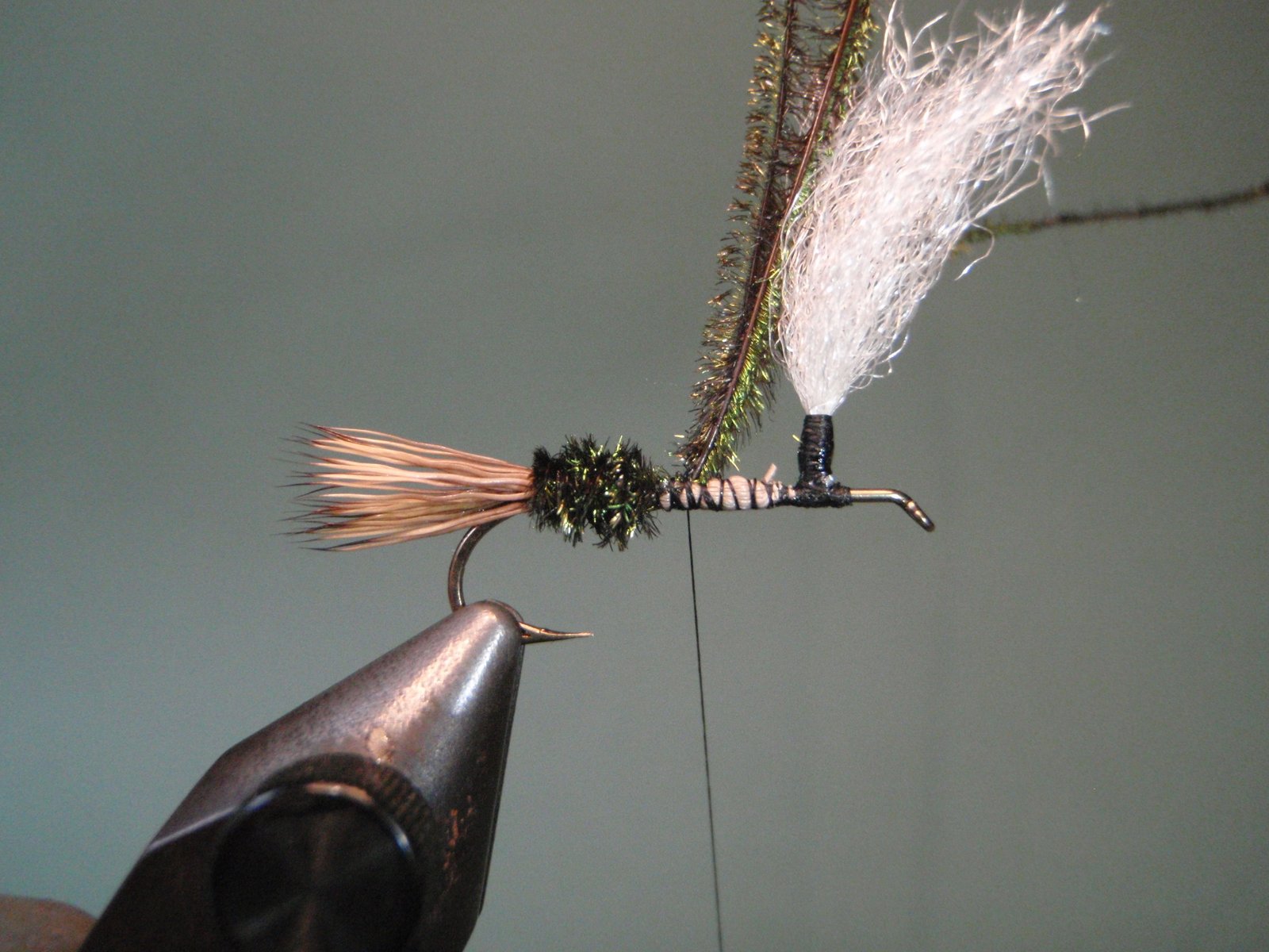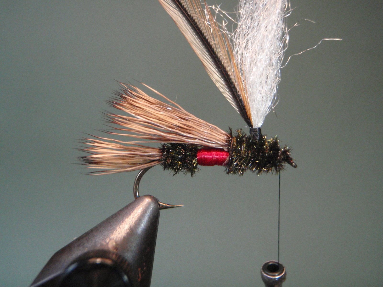 Atar un mechón de pelo de ternero blanco o material sintético (ej.: Z-lon), que servirá luego para enroscar en su base la pluma en estilo parachute y que nos permitirá visualizar mejor la mosca cuando la estemos usando.