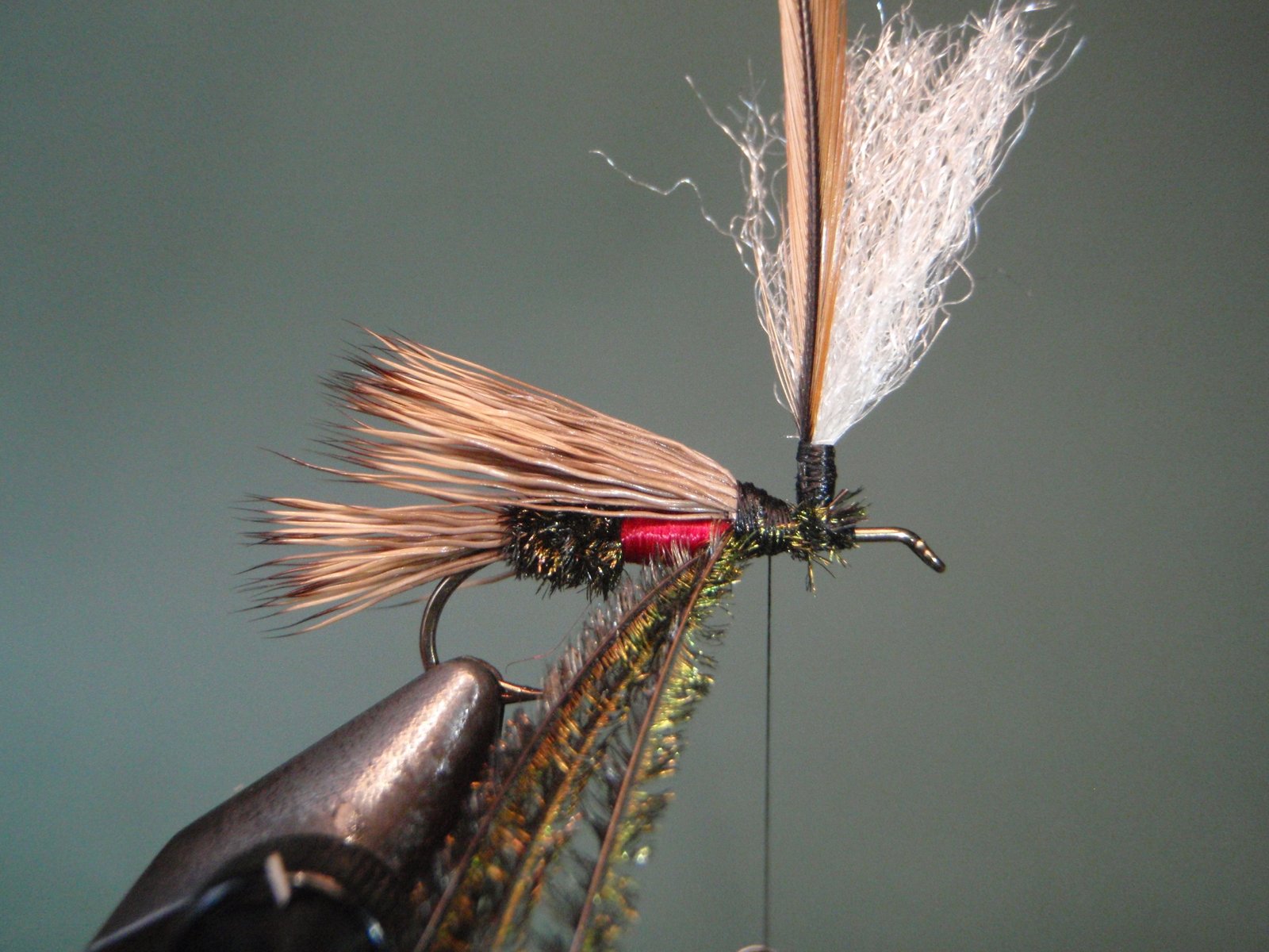 Cuerpo: 30% de la pata de pavo real, 30% de cintura de floss rojo y 40% de pavo real hasta el ojo del anzuelo.