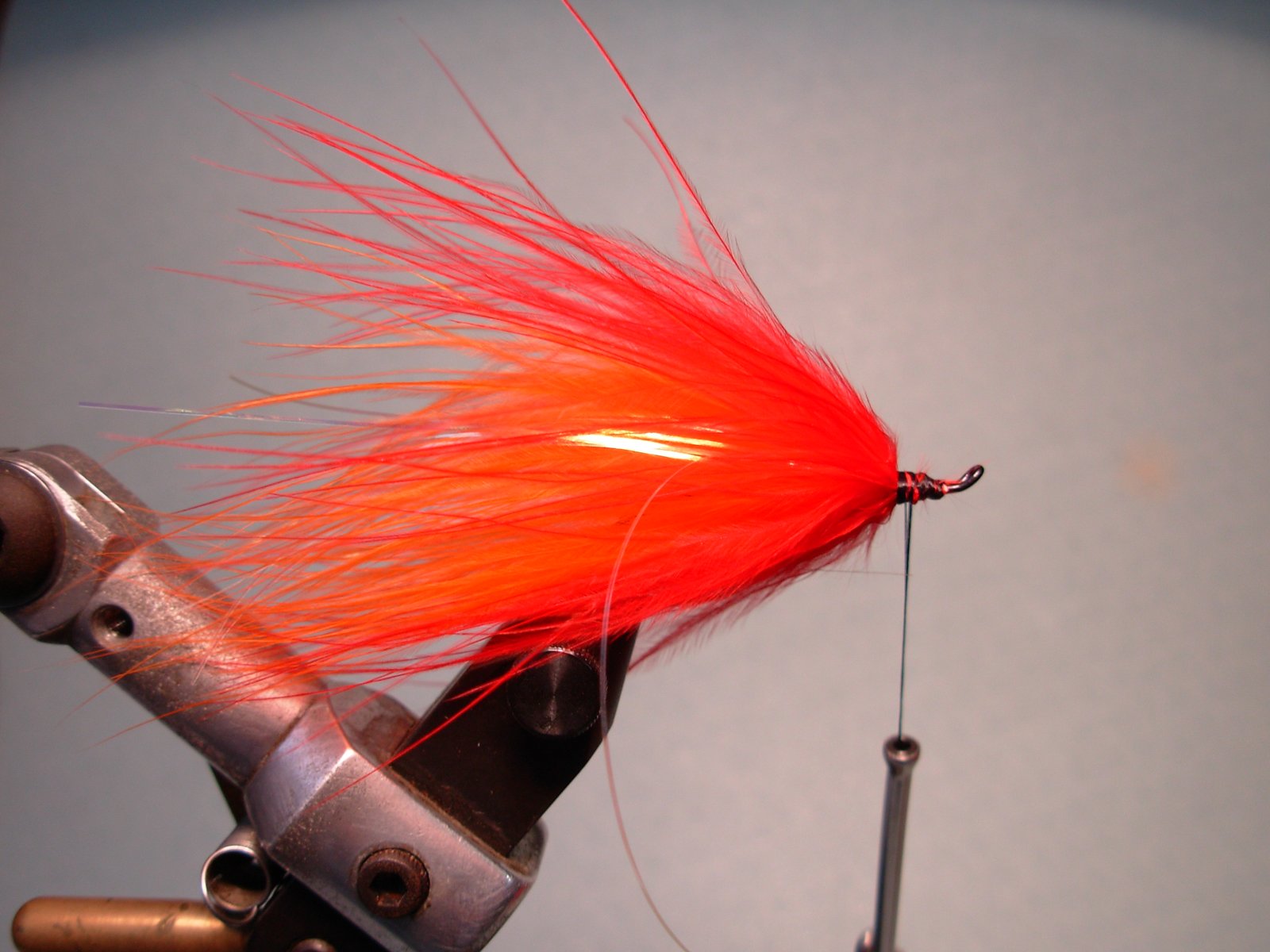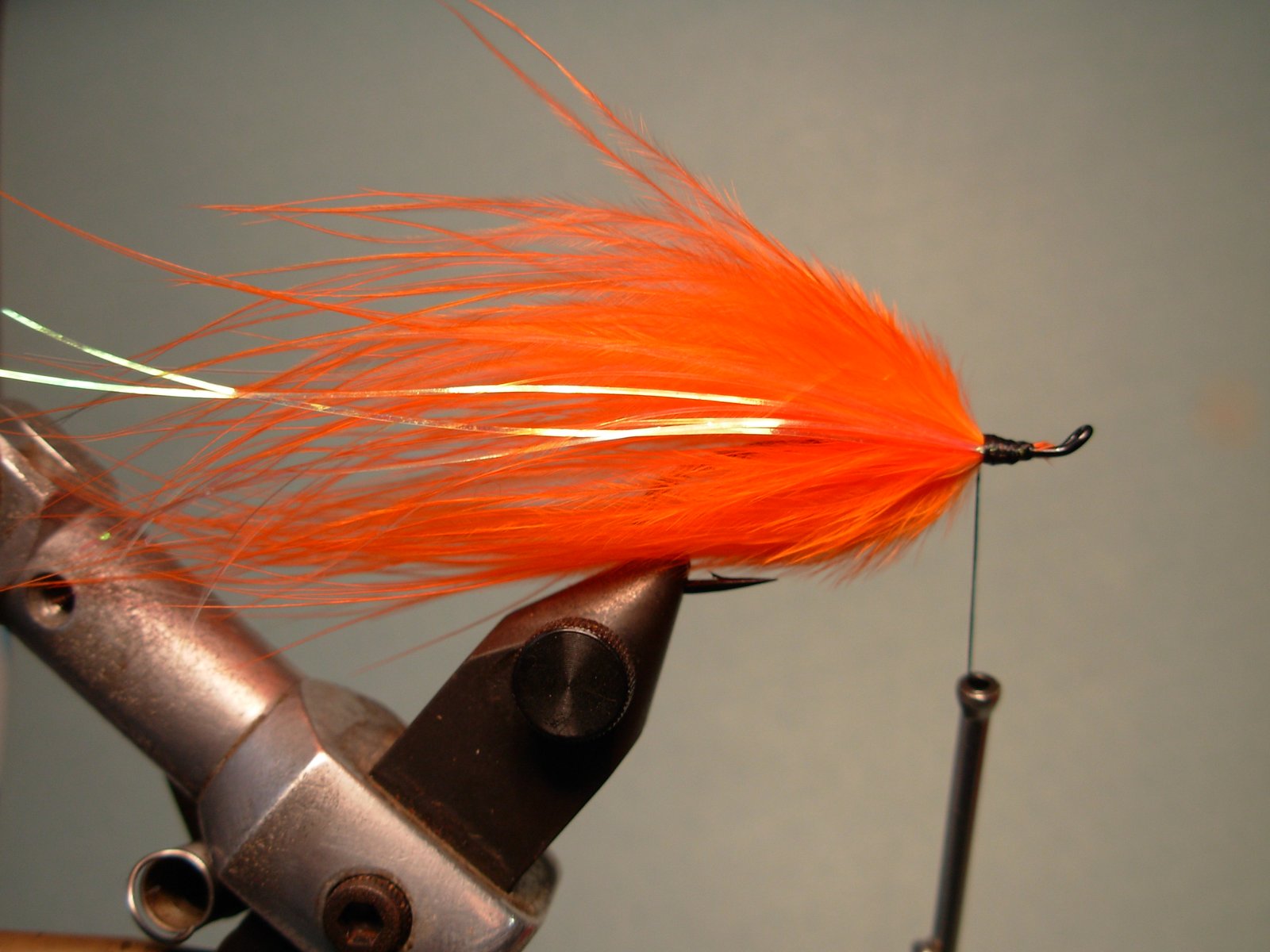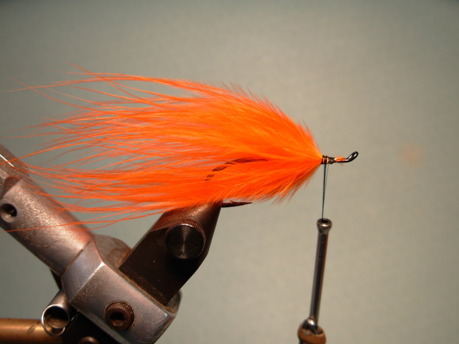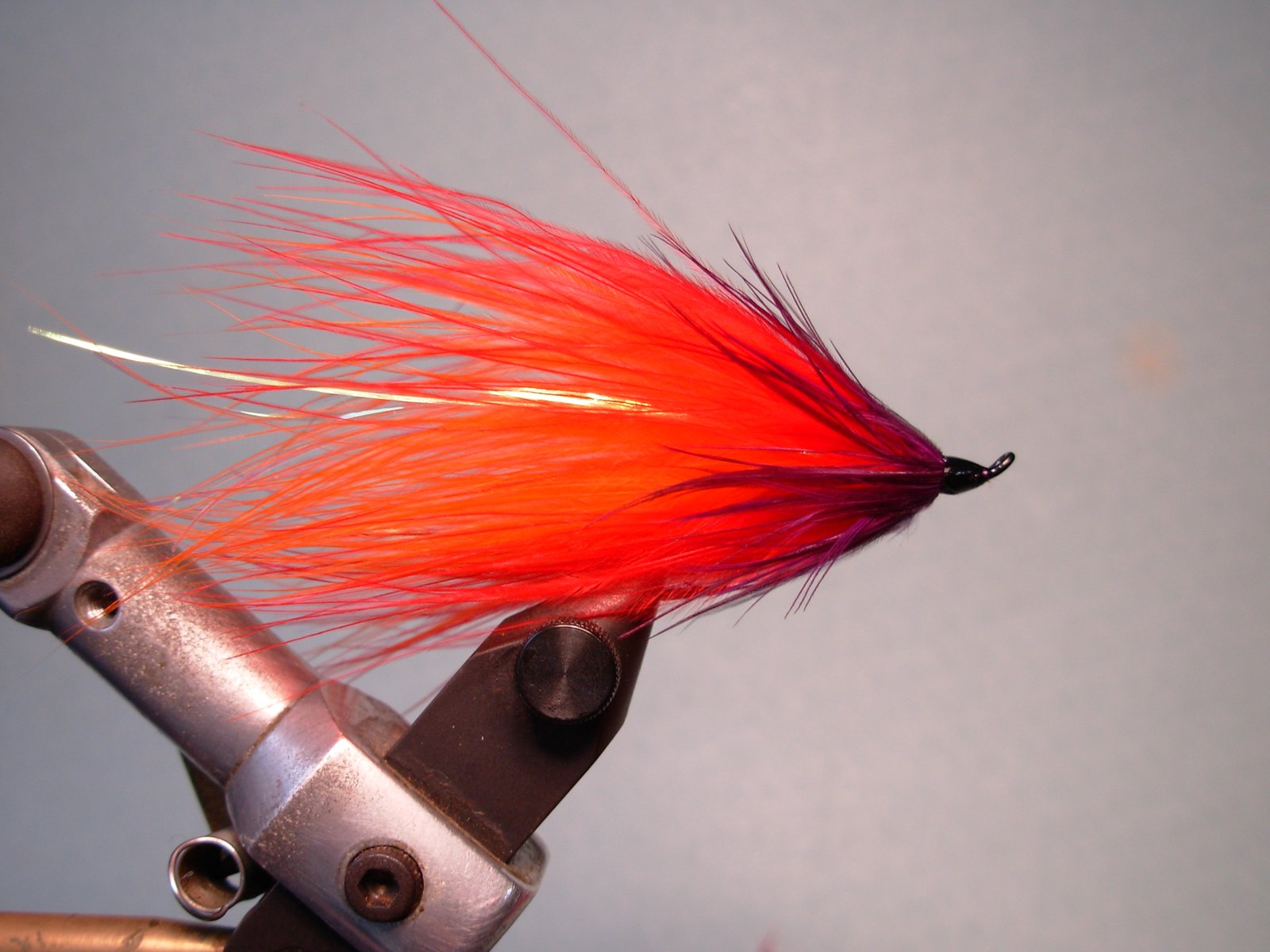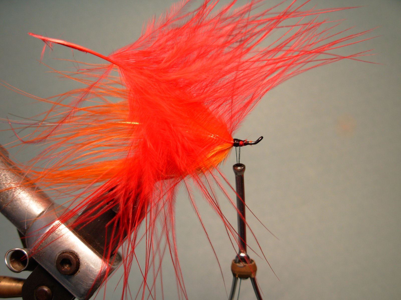 Ala: Pluma de marabou naranja enroscada a la pata del anzuelo y sobre esta otra de color rojo también enroscada.