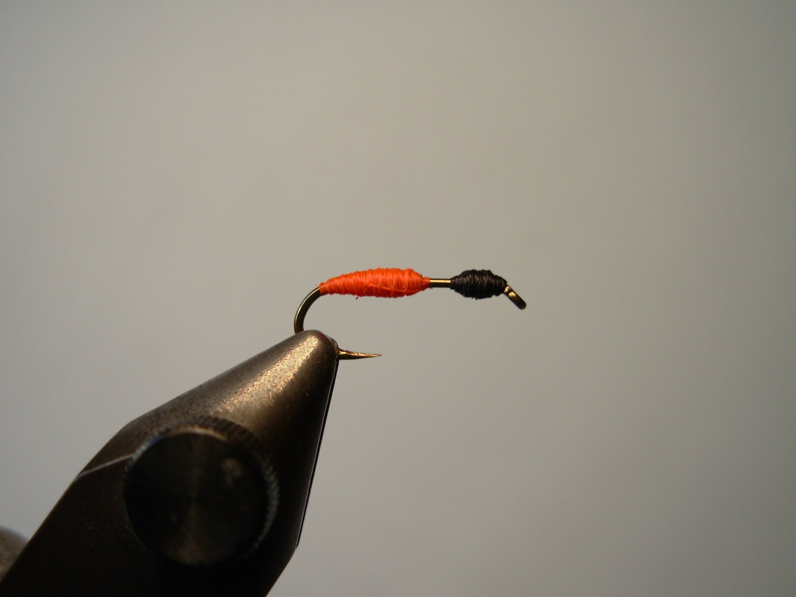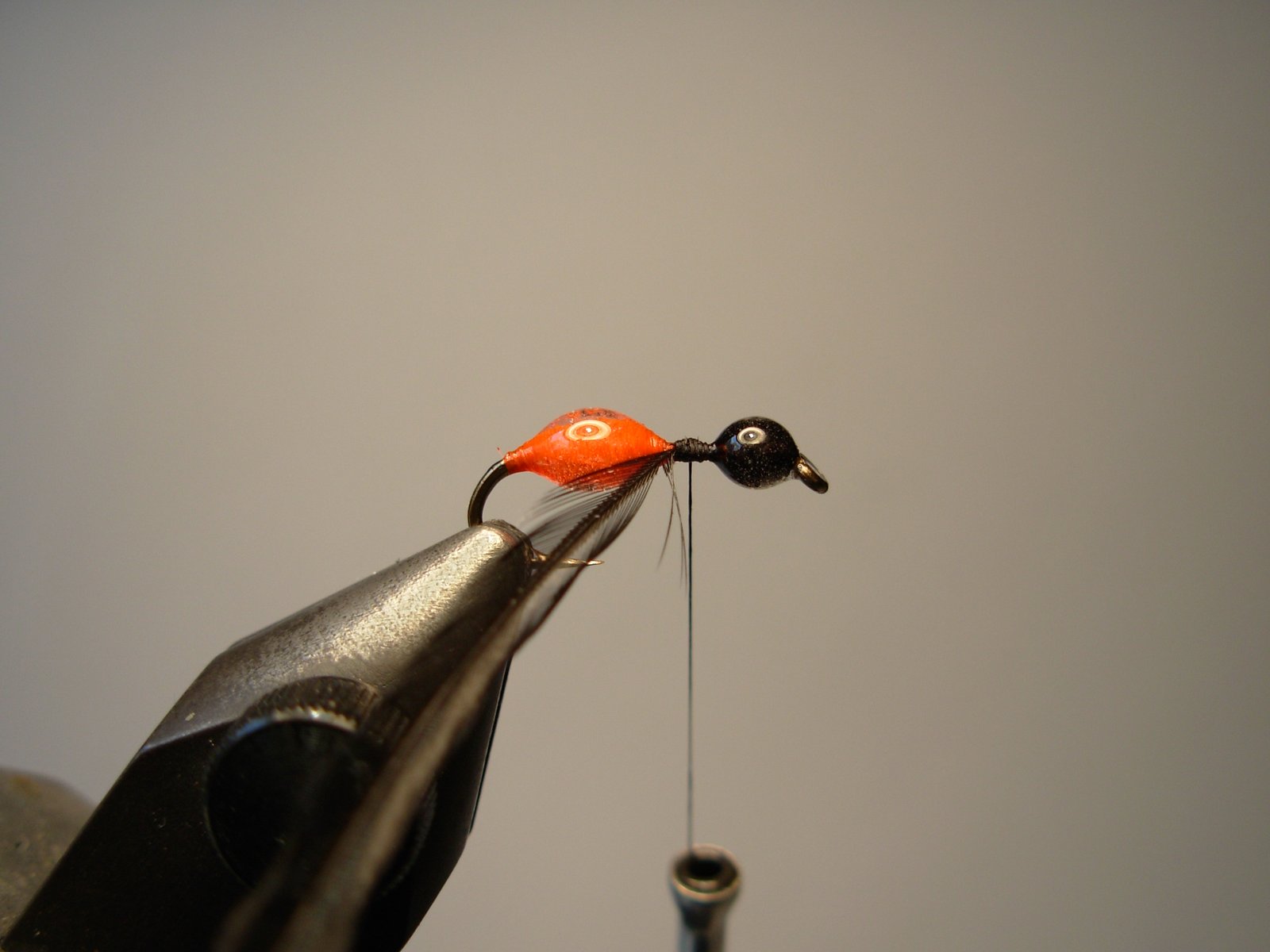 Confeccionar la cabeza con el hilo negro dejando un espacio libre entre esta y el abdomen ya que en esa angostura se atará en hackle de gallo que oficiará de patas.