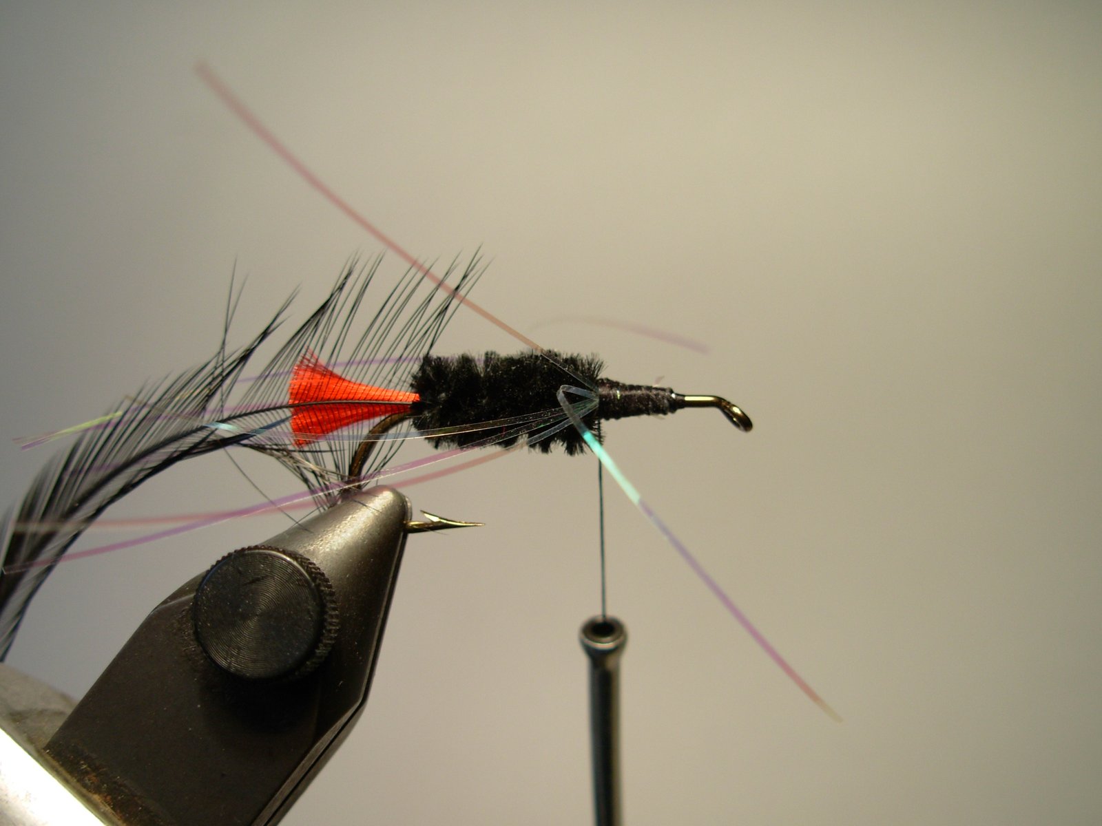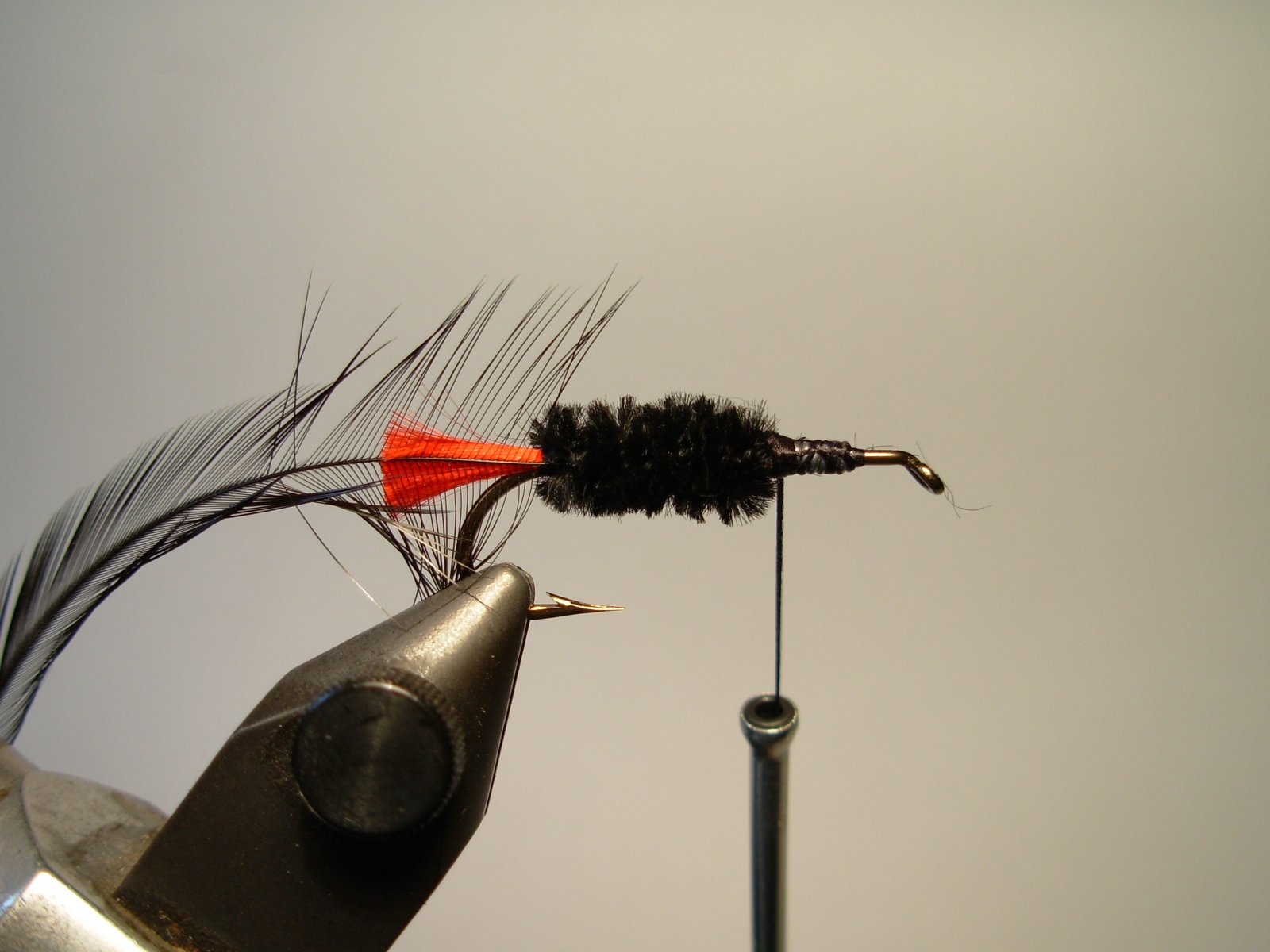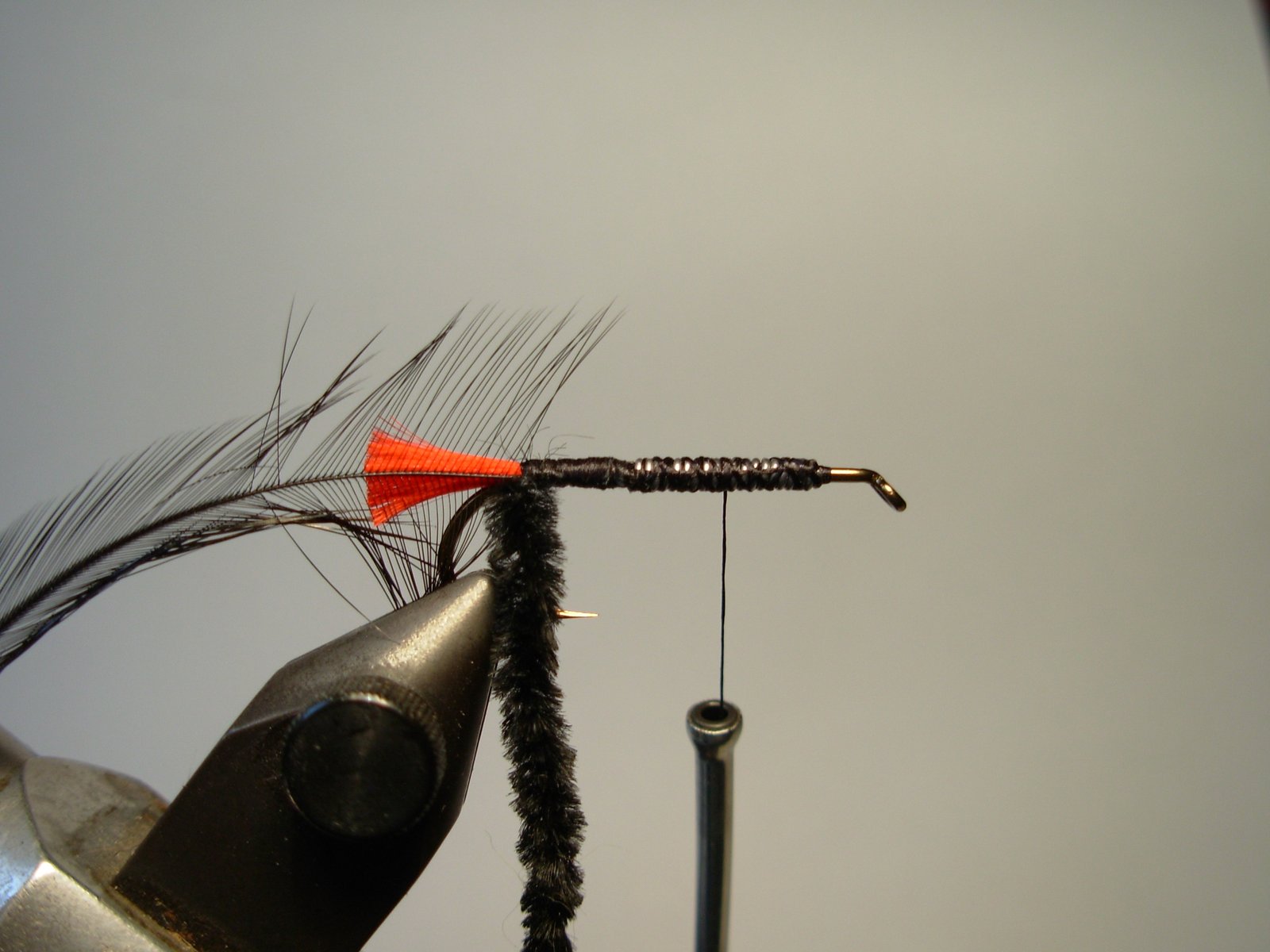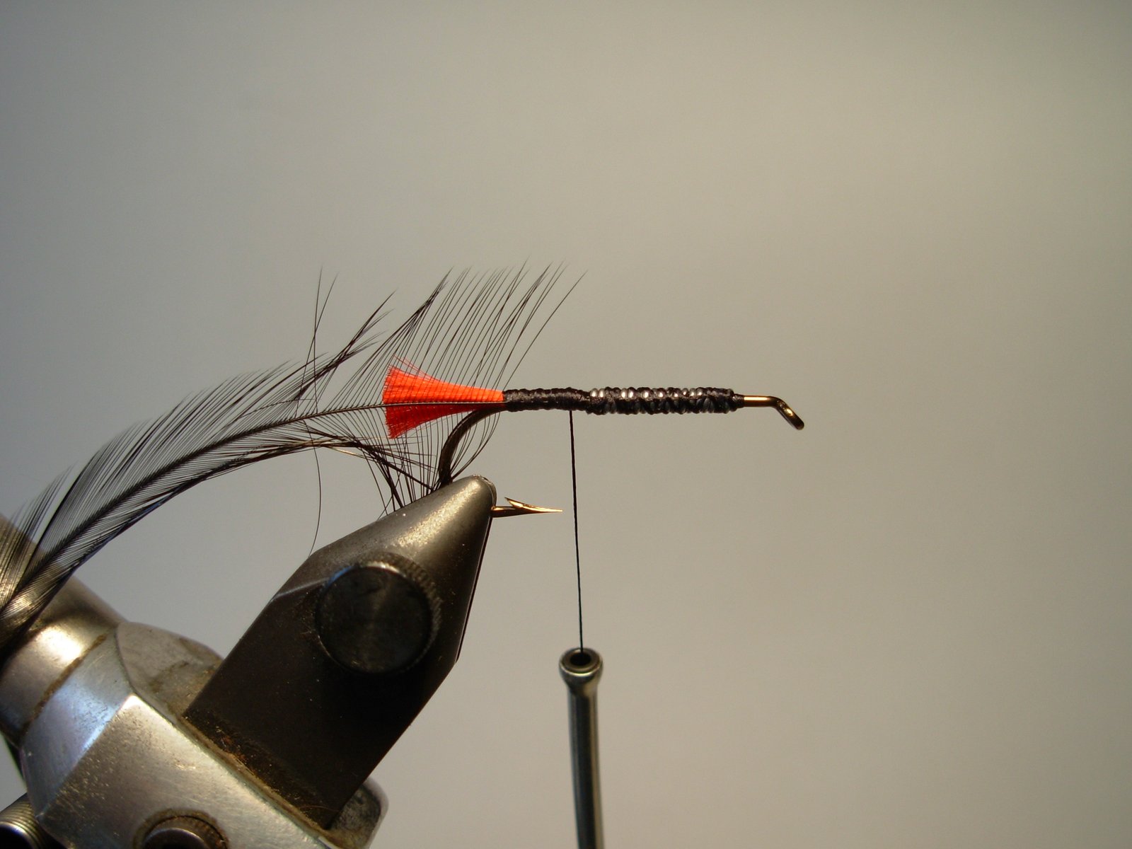 Atar una pluma de gallo negra con fibras de un largo aproximado a una vez y media la abertura del anzuelo (gap).