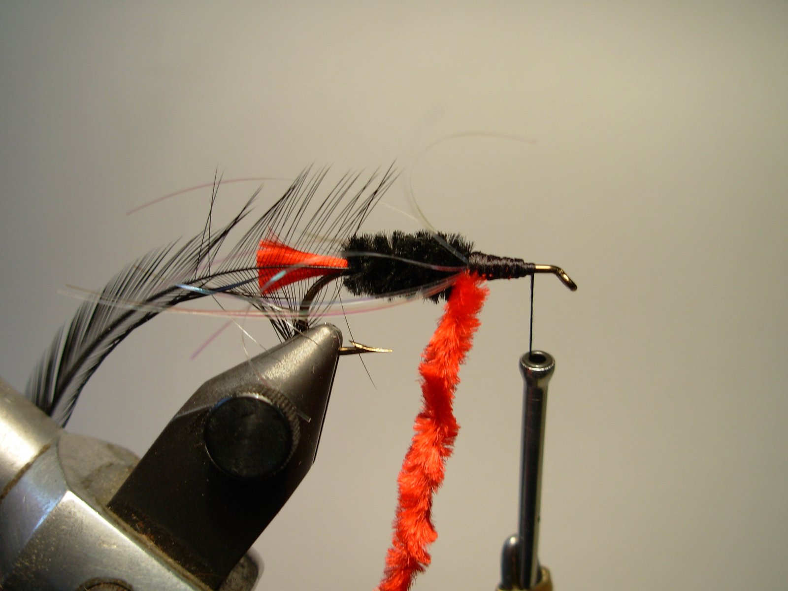 Atar el chenille rojo en el mismo punto que el flashabou.