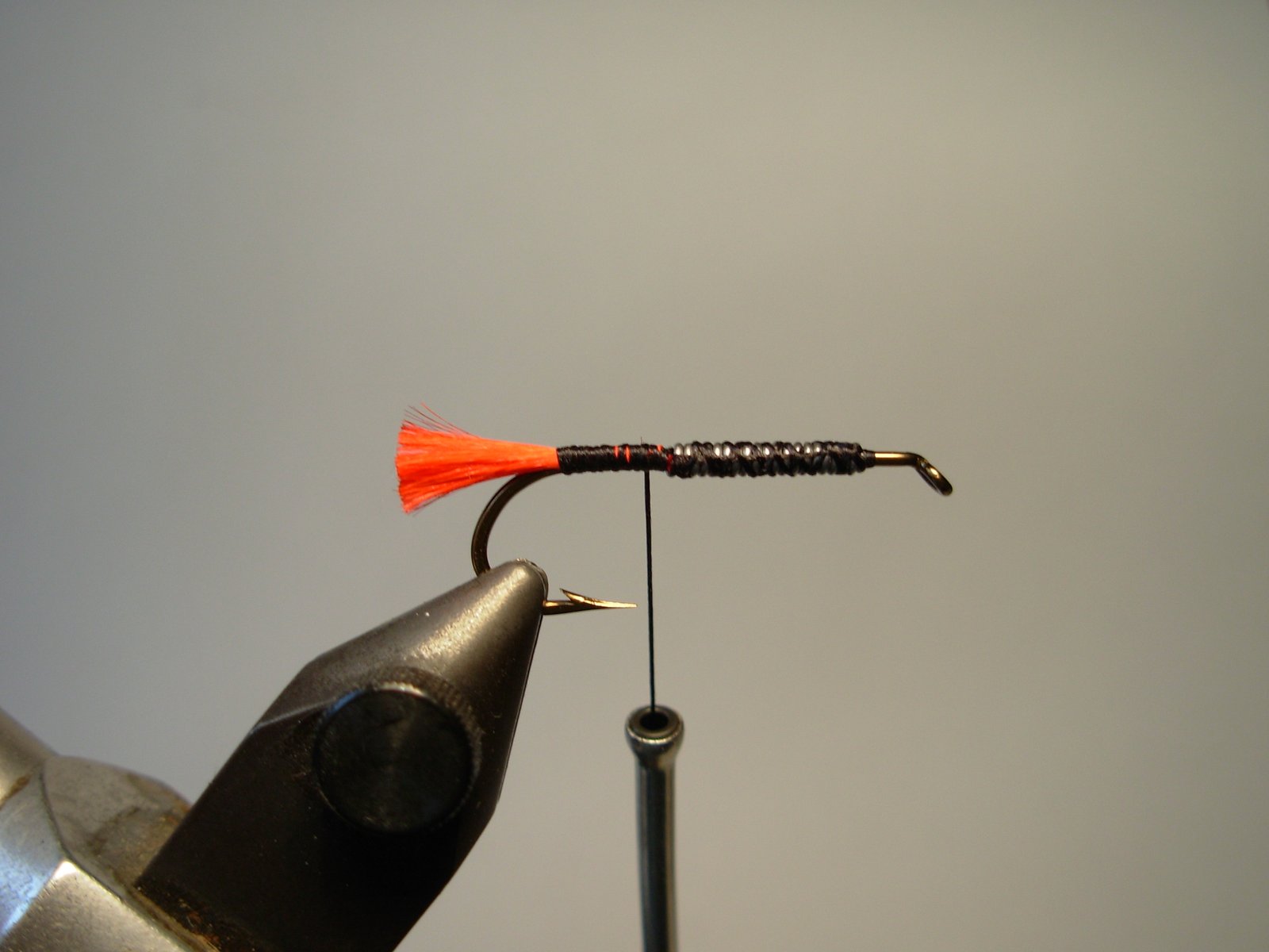 Atar el mechón de floss rojo desde donde termina el alambre de plomo hasta llegar a la altura de la lanceta del anzuelo.