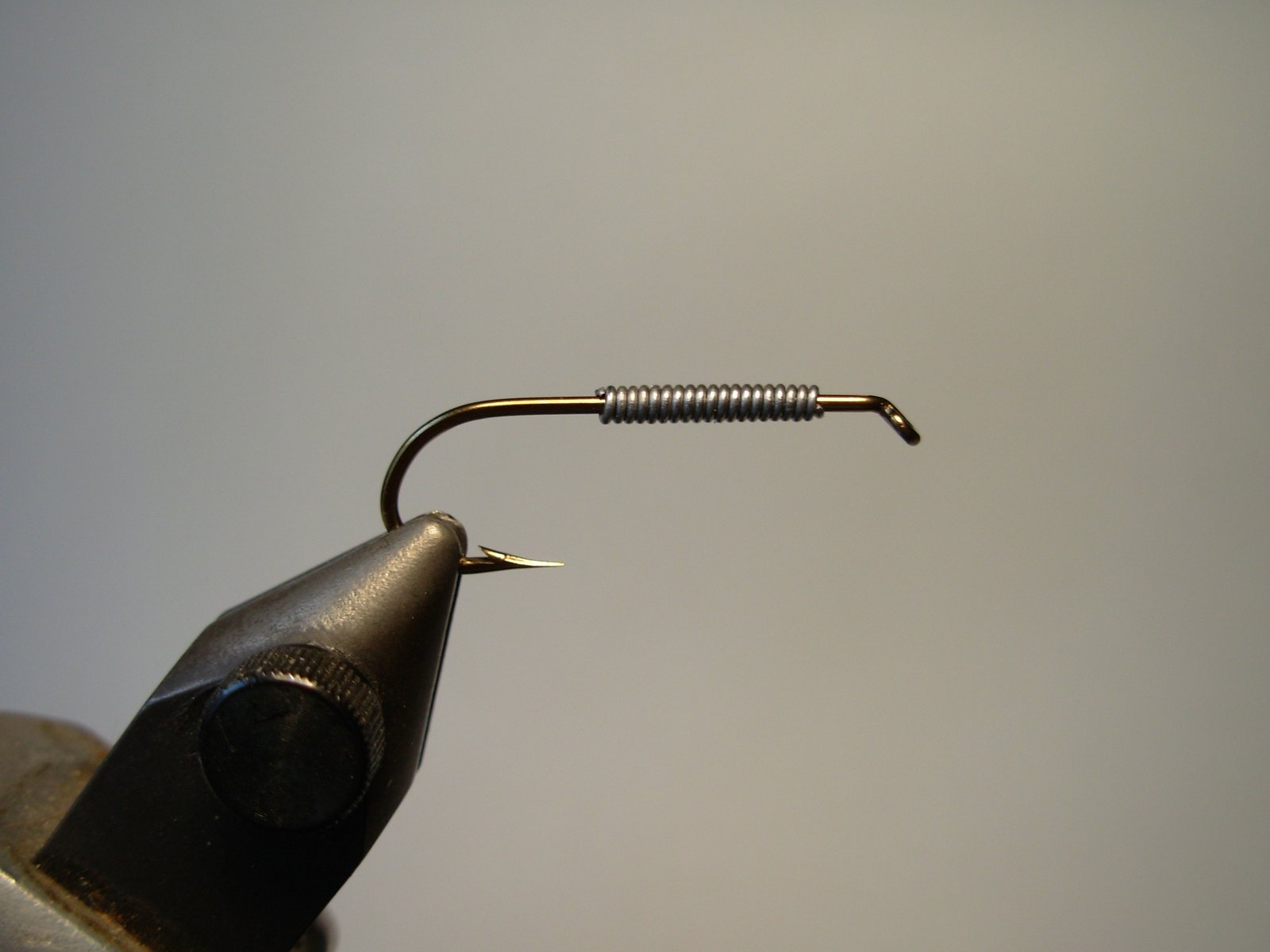 Enroscar alambre de plomo a lo largo de parte de la pata del anzuelo dejando un poco de espacio atrás y un poco menos junto al ojo del anzuelo.
