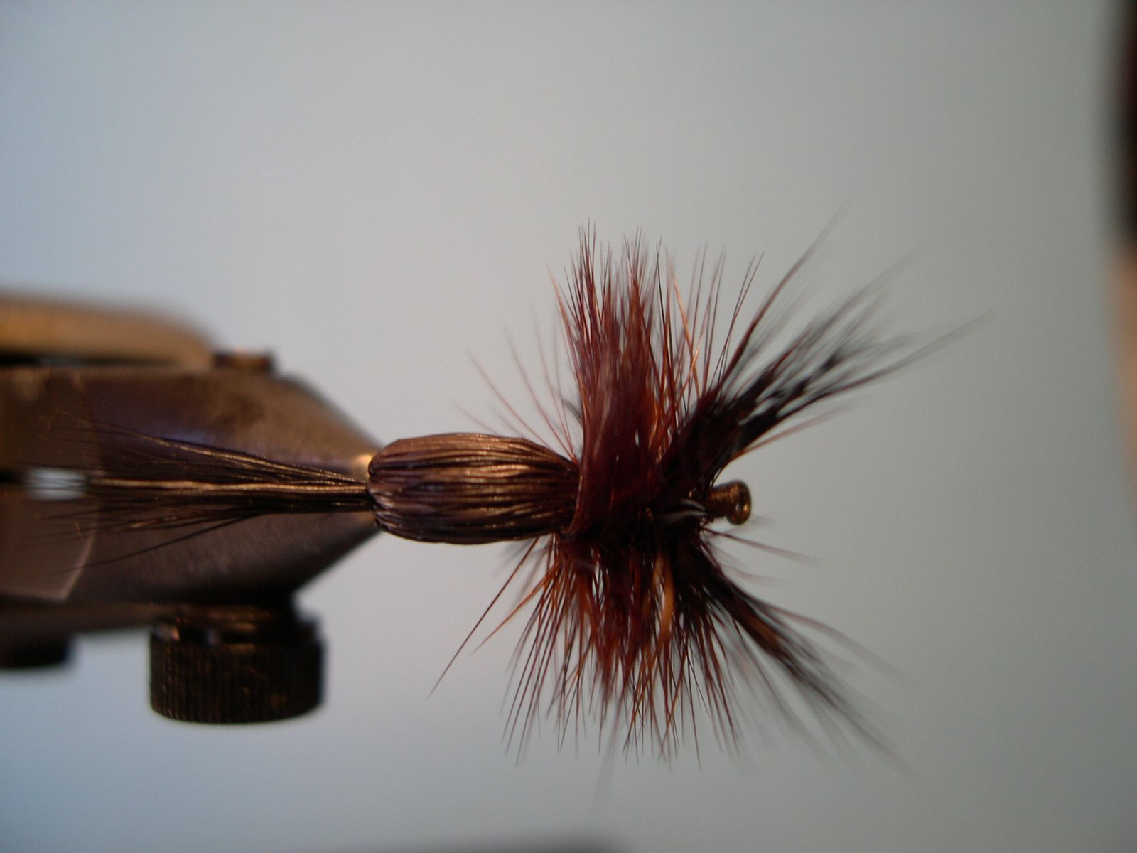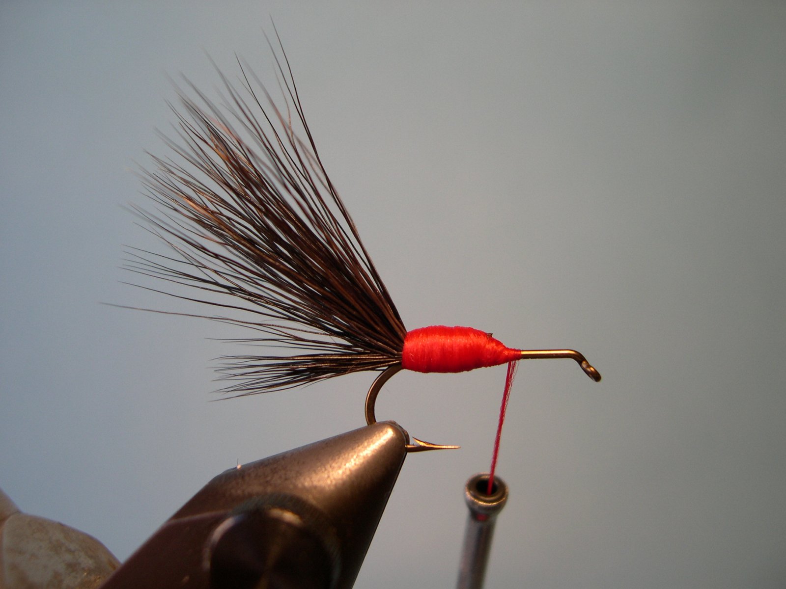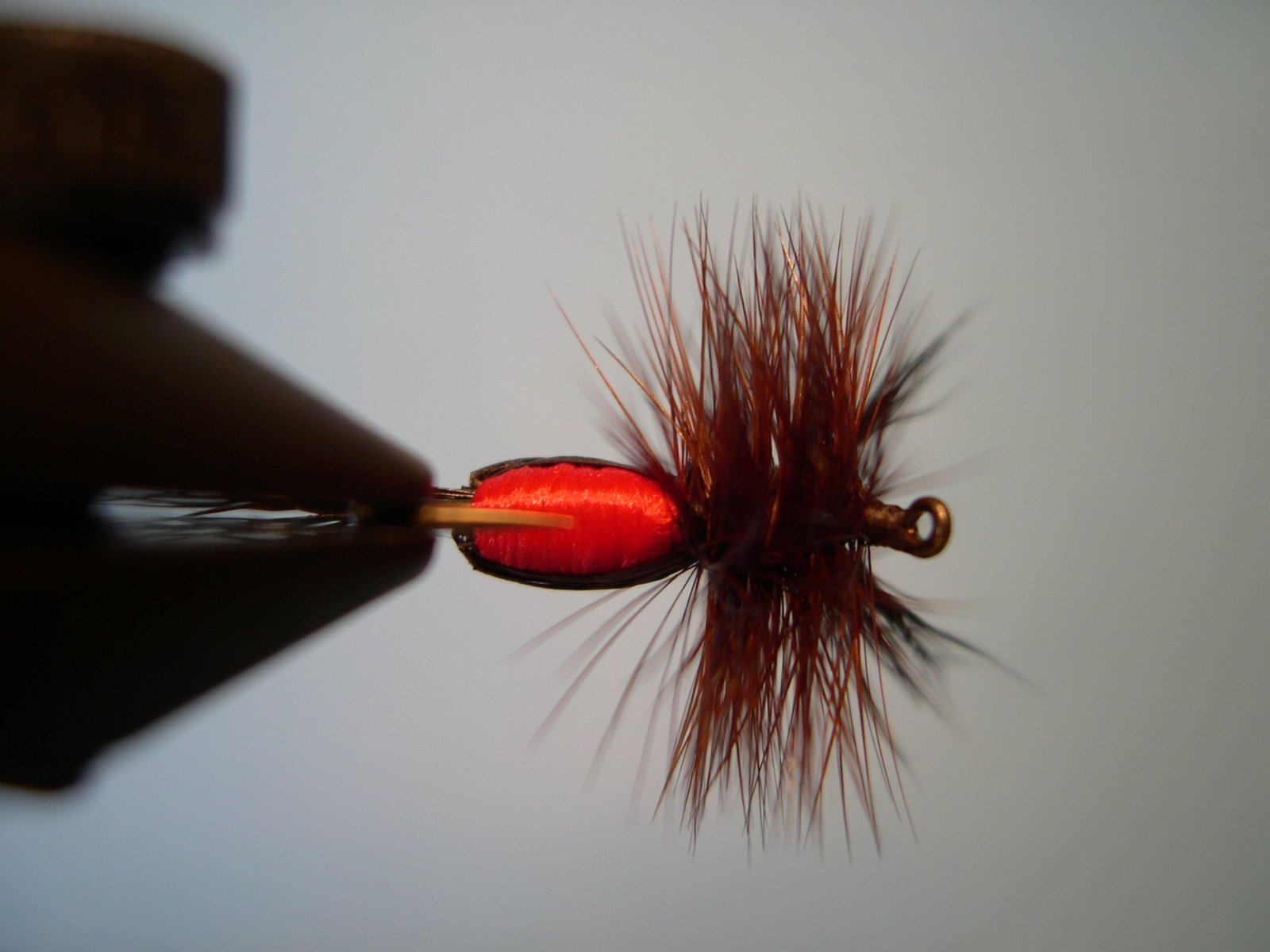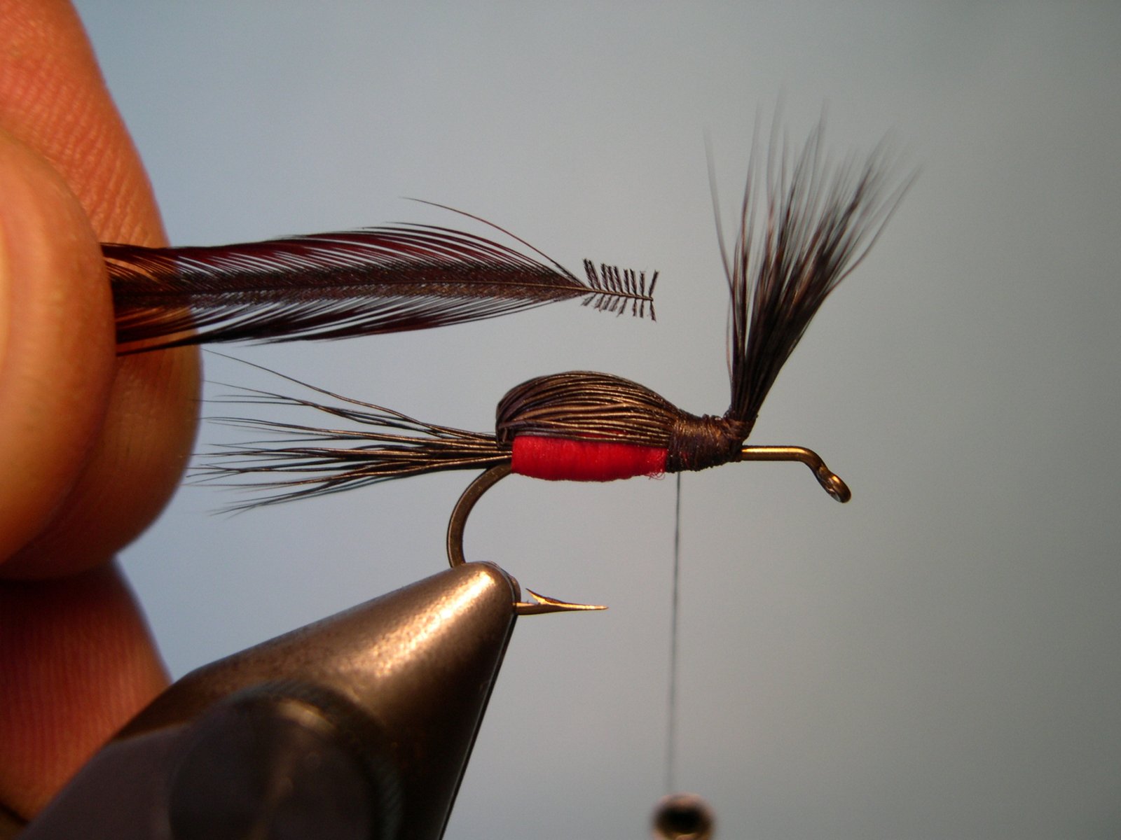 Enroscar la pluma de atrás hacia adelente hasta el ojo del anzuelo, cortar el sobrante, hacer el nudo final y cementar.