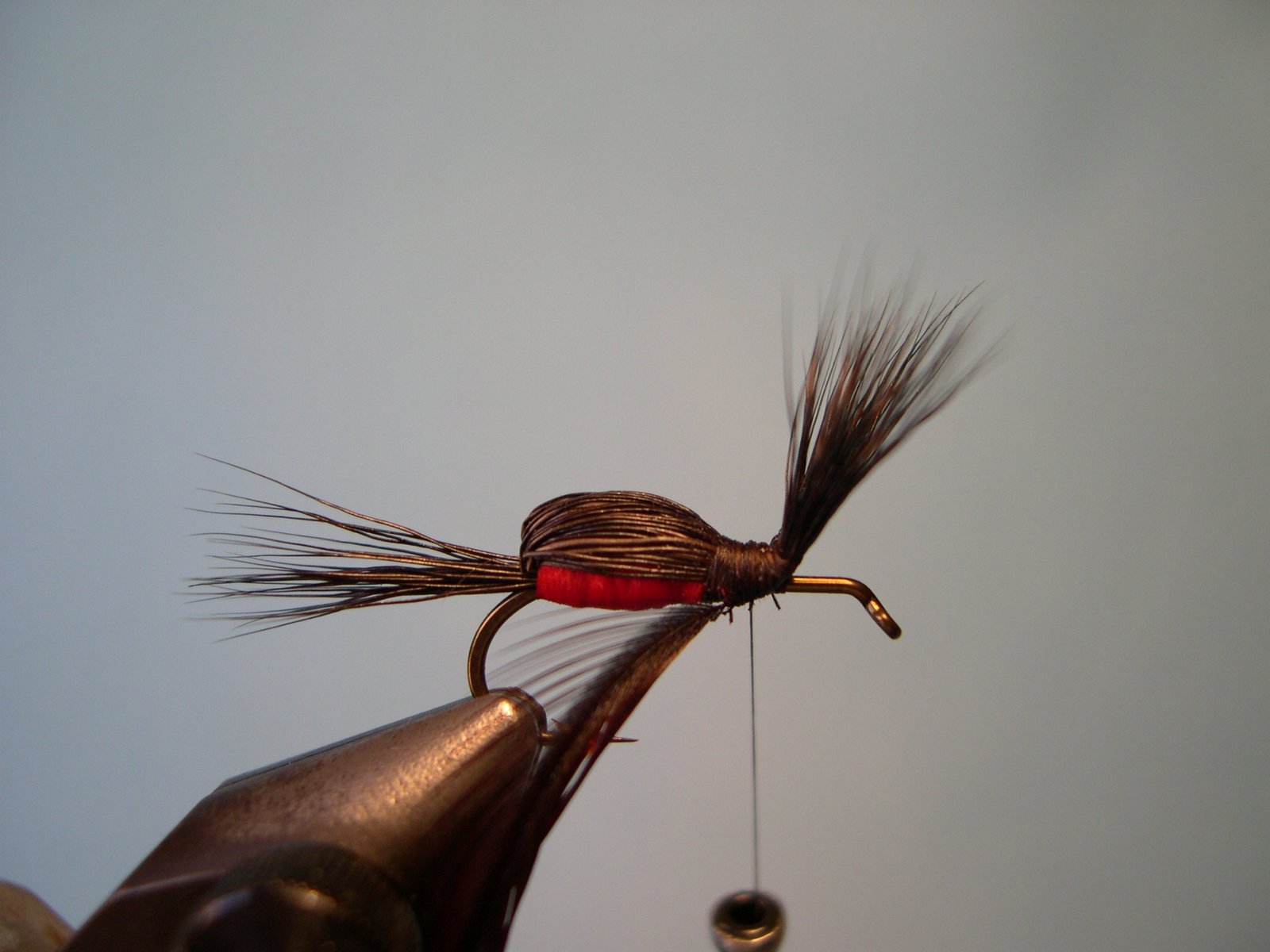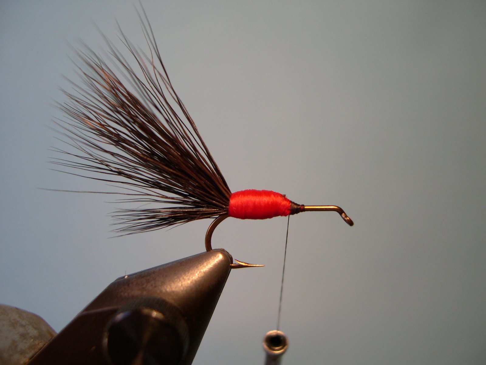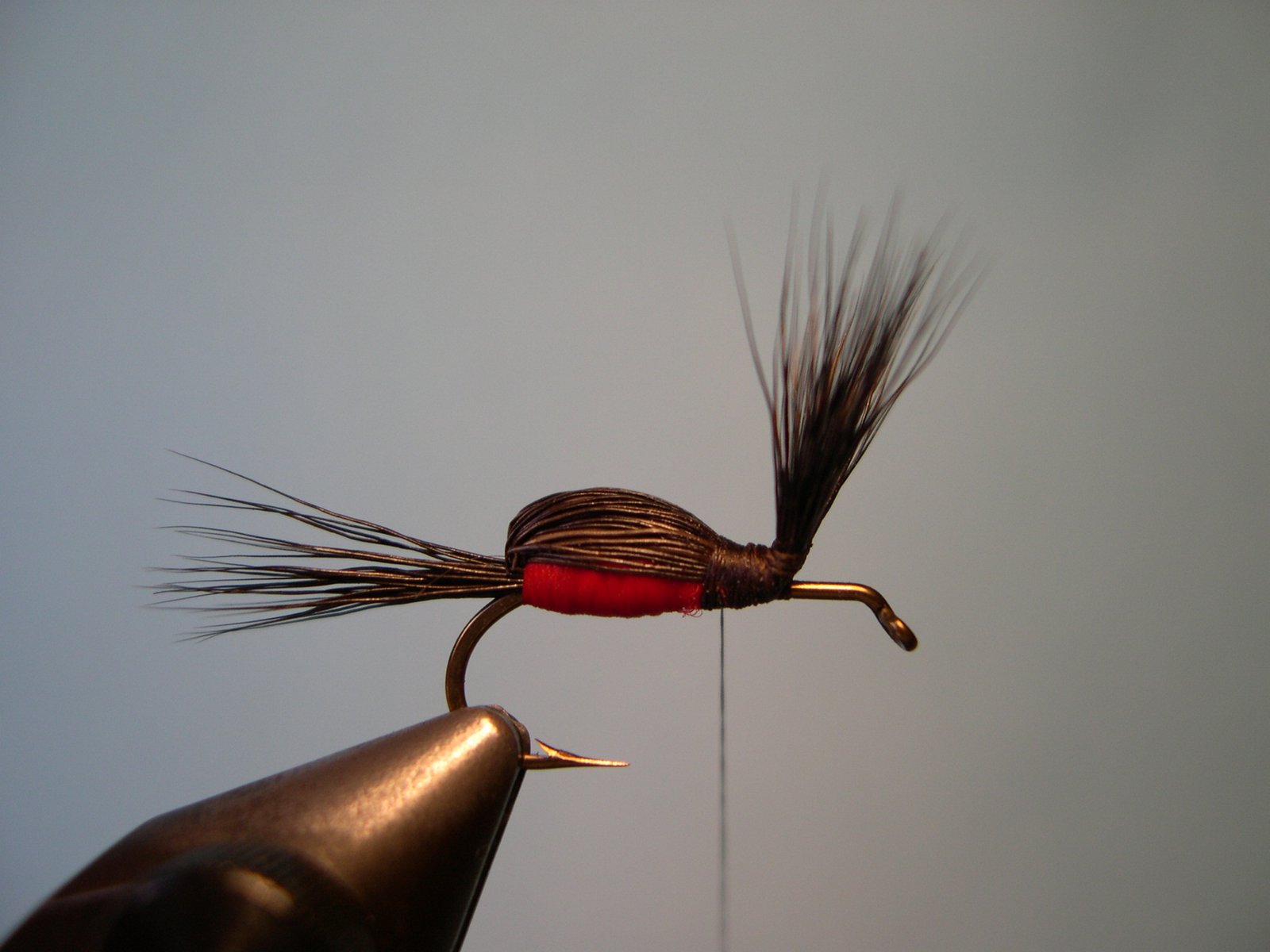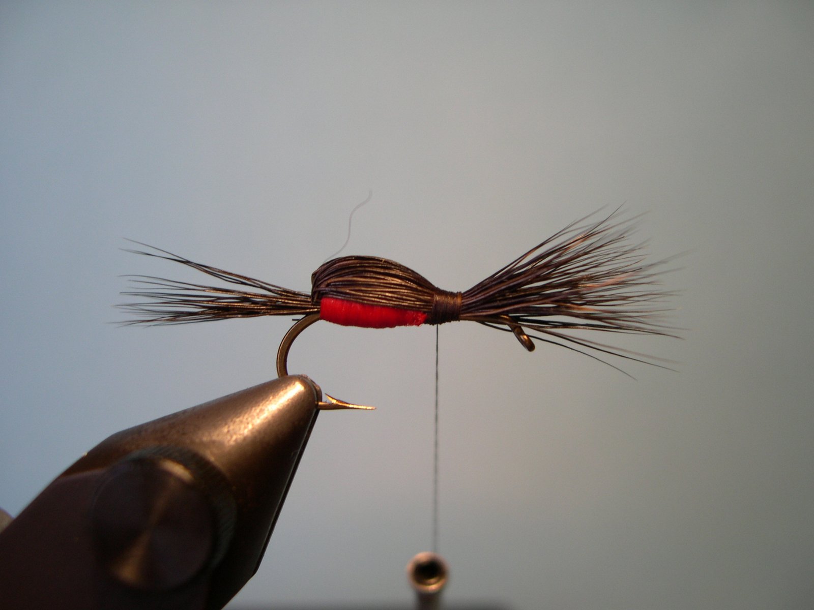 Enroscar la pluma de atrás hacia adelente hasta el ojo del anzuelo, cortar el sobrante, hacer el nudo final y cementar.