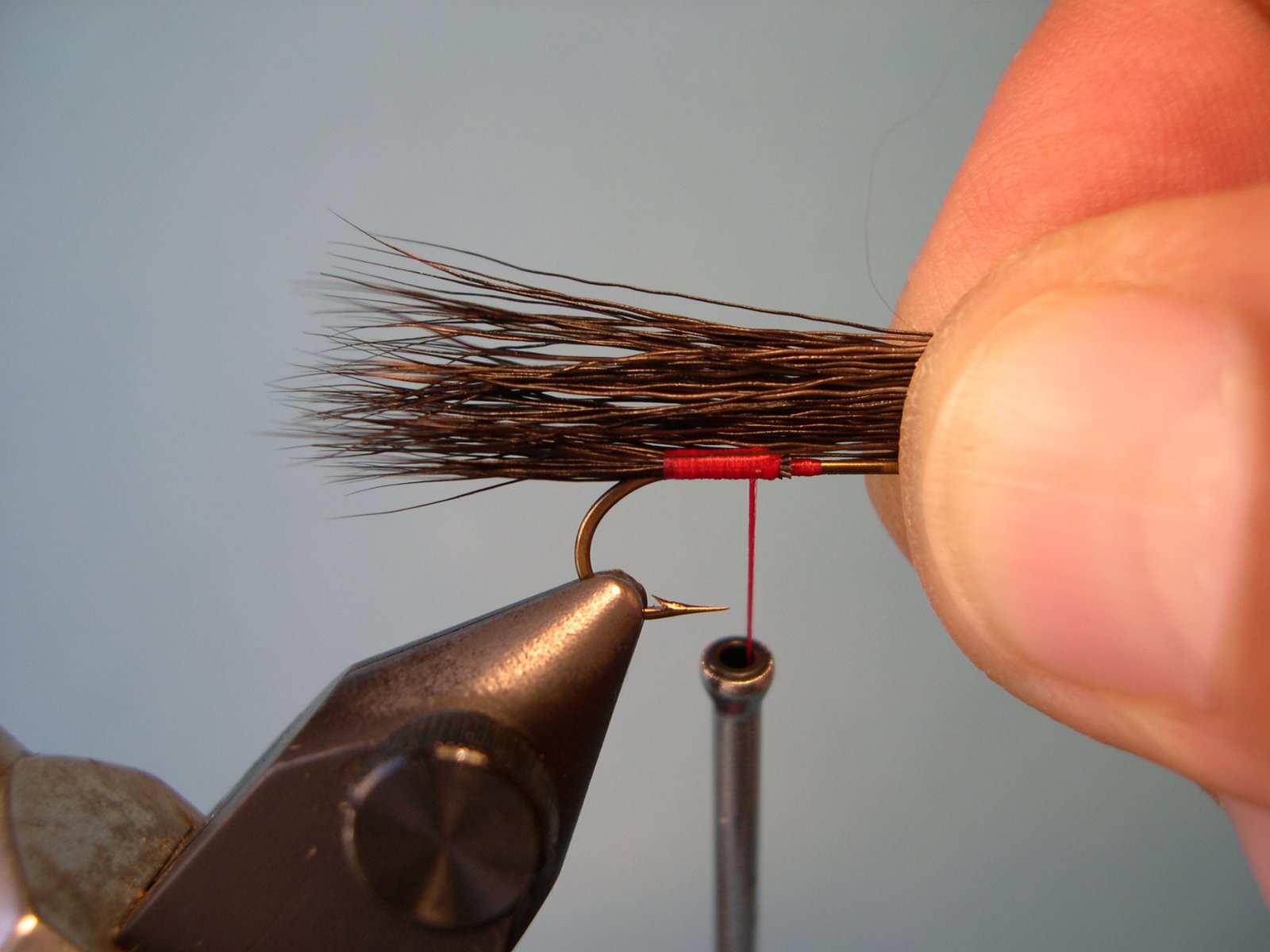 Volcar todo el mechón de pelo de moose hacia delante, cuidando de no arrastrar pelos de la cola, y atarlos sobre la pata del anzuelo.