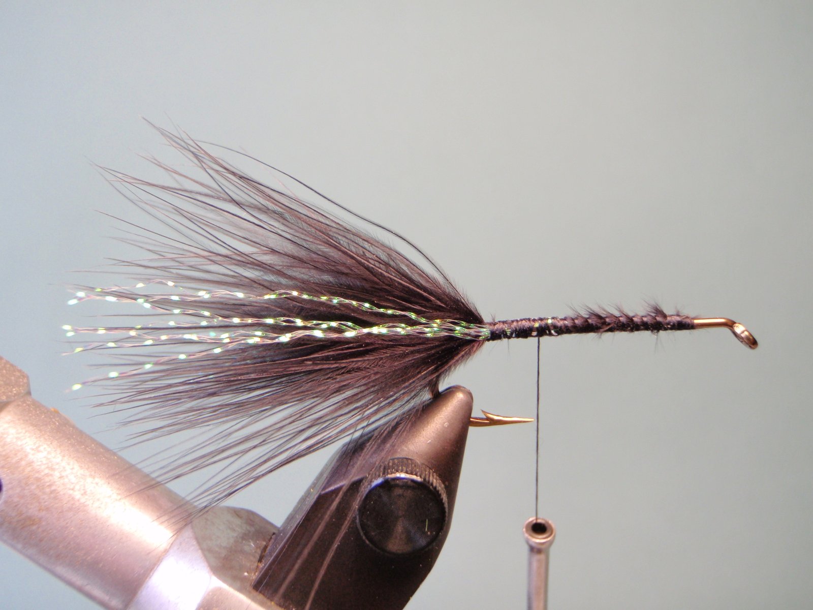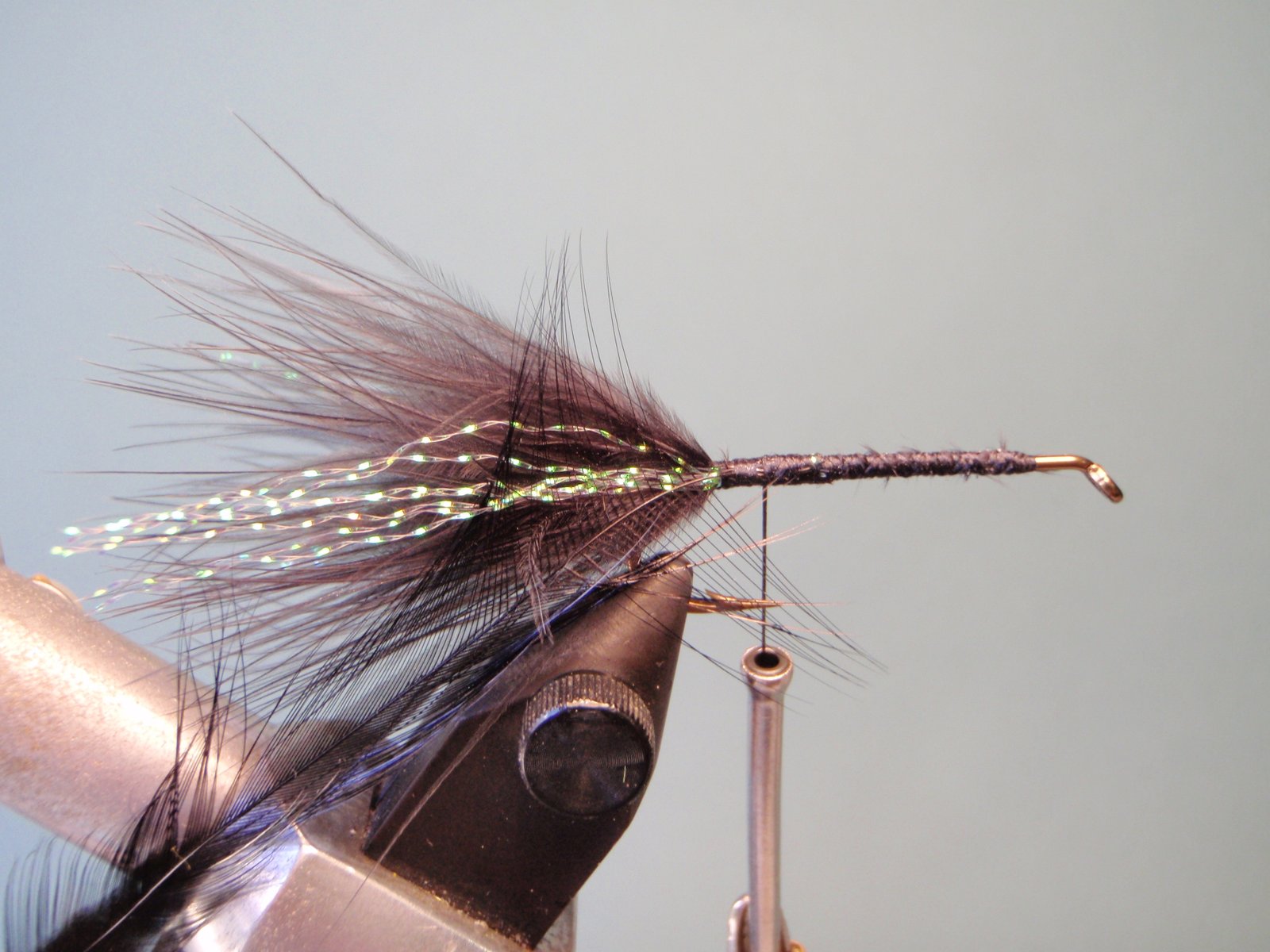 Atar por la punta una pluma de gallo negro con fibra de un largo equivalente a una vez y media (a dos veces) la abertura del anzuelo (gap)