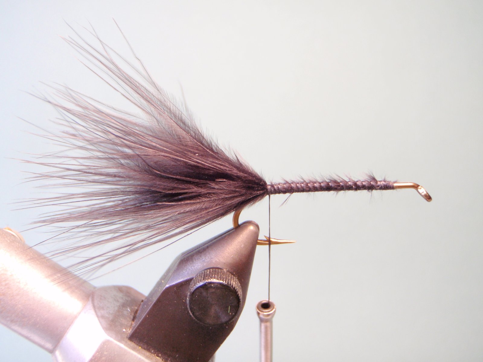 Enroscar en “palmer” la pluma de gallo a lo largo de todo el cuerpo de la mosca hasta el ojo del anzuelo y confeccionar la cabeza de la mosca con el hilo.
