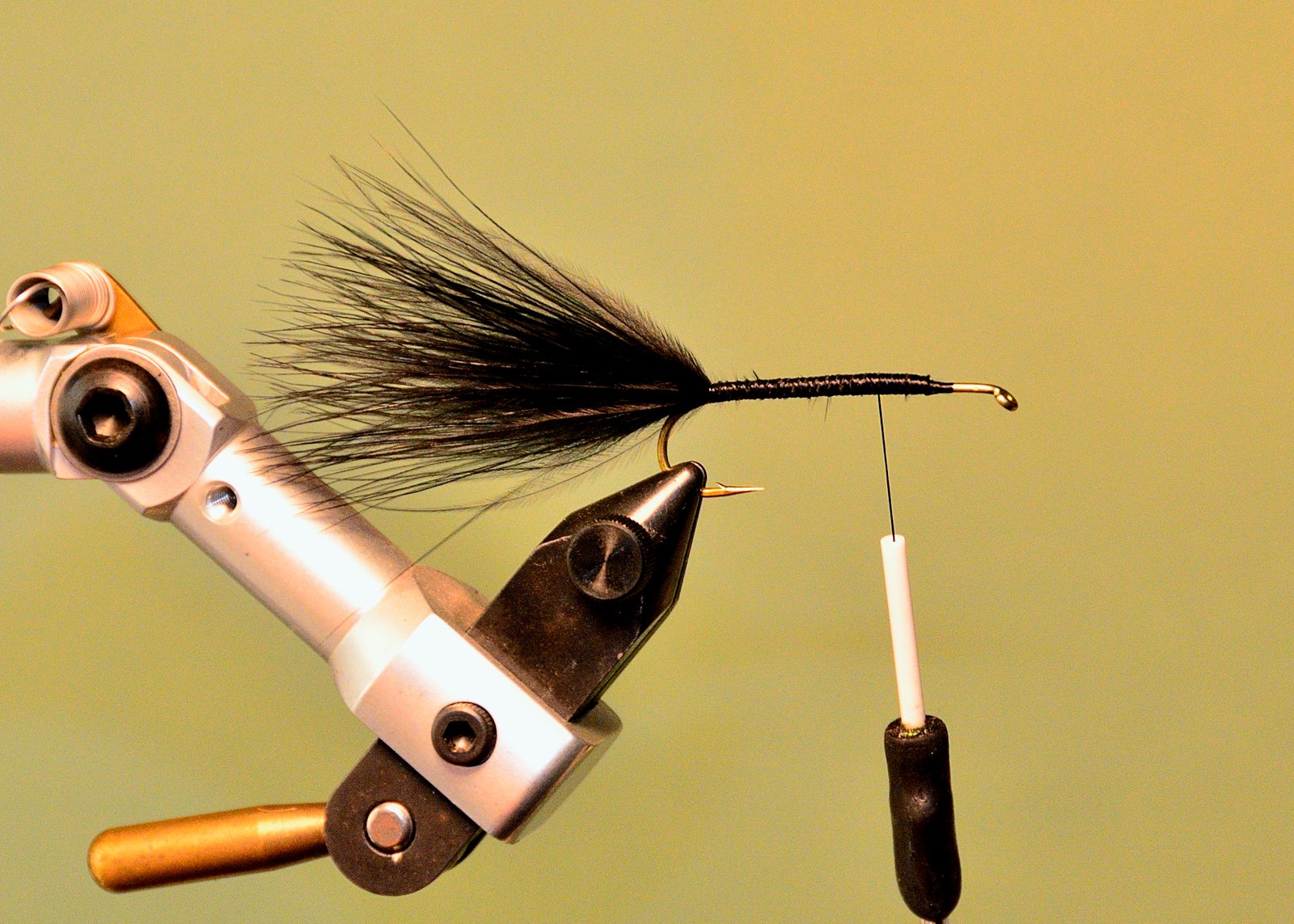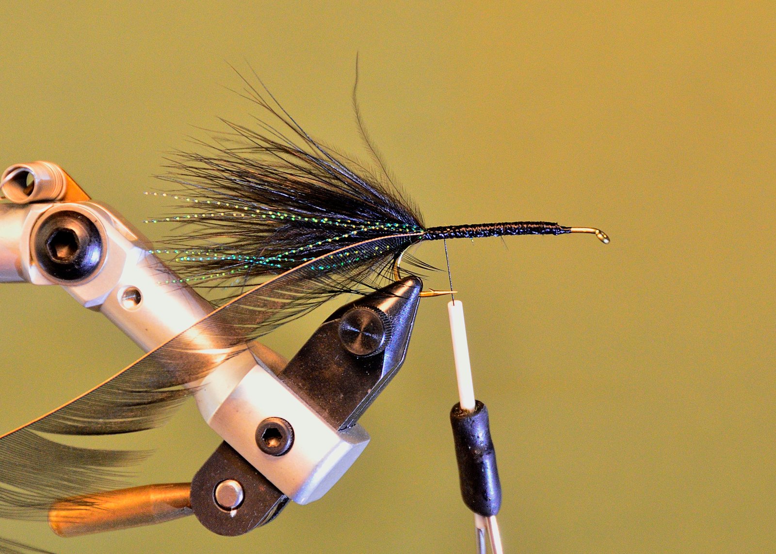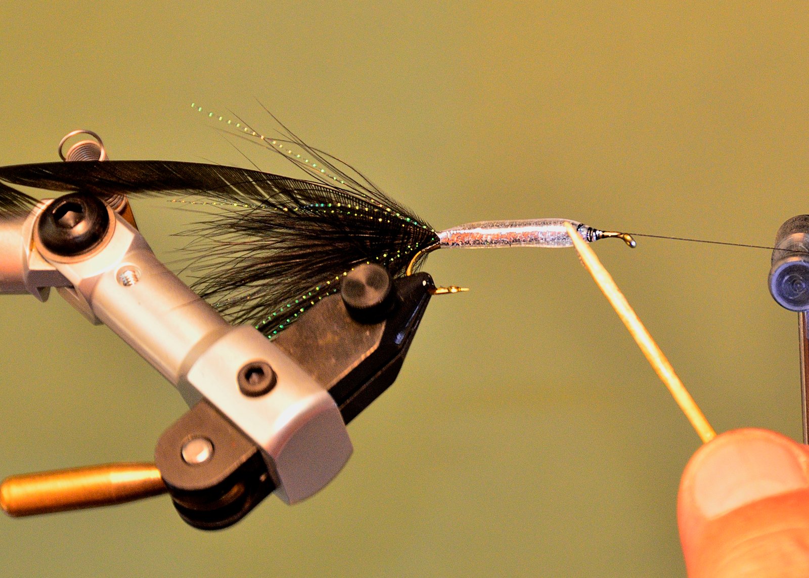 7 Comenzar a enroscar la pluma en palmer cuidando de que esta se apoye sobre el cuerpo del lado donde hemos quitado las fibras para que se vaya sumergiendo su raquis en el epoxi fresco. Esto solo se puede hacer si Ud. tiene una morsa rotativa pues hay que girar constantemente la mosca de atrás hacia delante para que, por gravedad, no se chorree el epoxi.