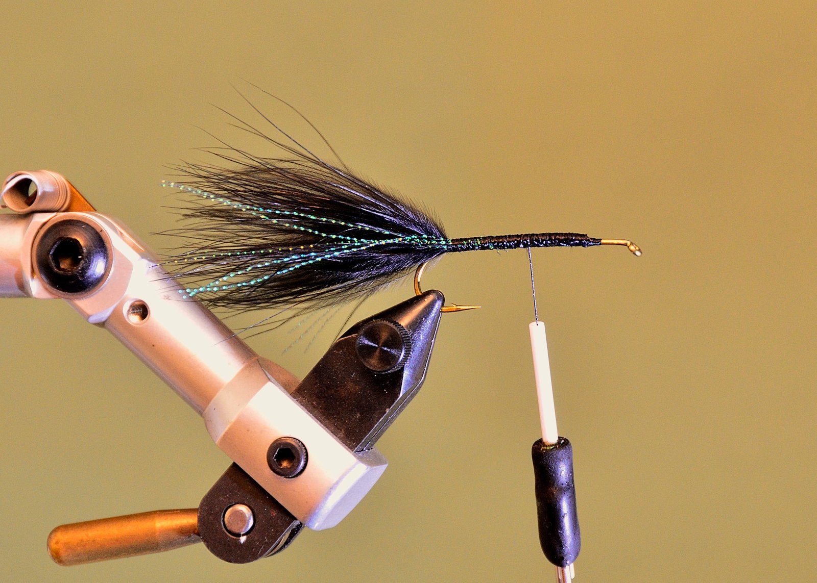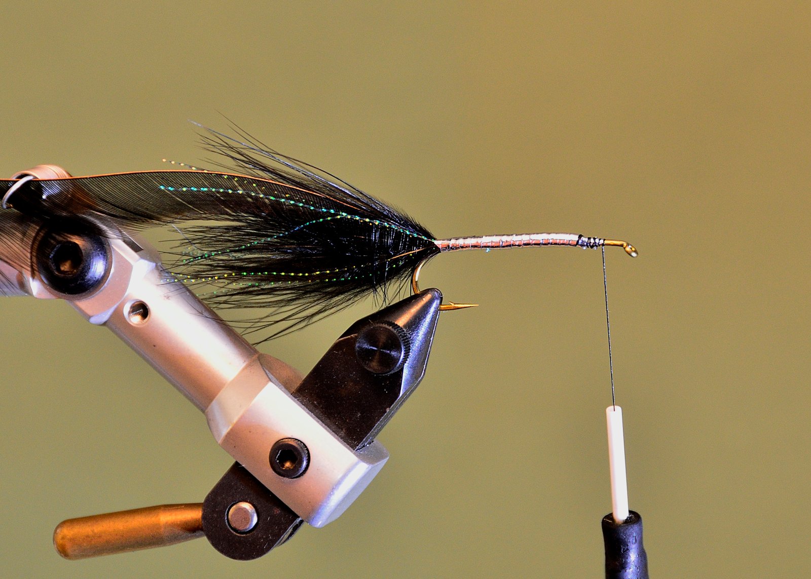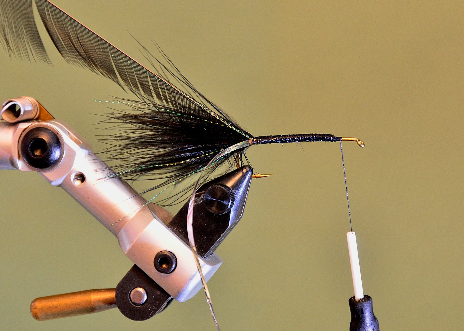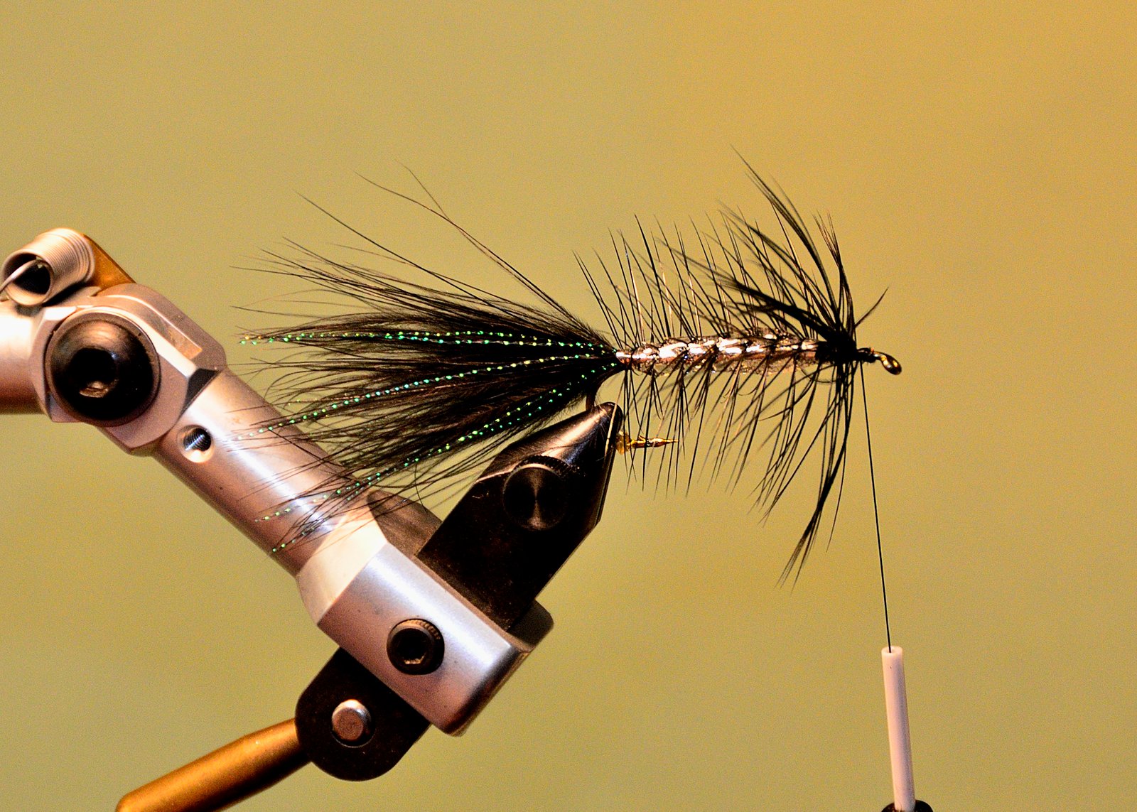 7 Comenzar a enroscar la pluma en palmer cuidando de que esta se apoye sobre el cuerpo del lado donde hemos quitado las fibras para que se vaya sumergiendo su raquis en el epoxi fresco. Esto solo se puede hacer si Ud. tiene una morsa rotativa pues hay que girar constantemente la mosca de atrás hacia delante para que, por gravedad, no se chorree el epoxi.
