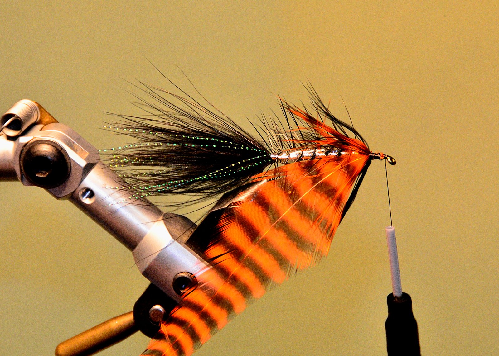 9 Una vez que fraguó el epoxi (convendría dejarlo al menos una hora para que seque bien) atar una pluma de gallo bataraz teñido de naranja junto al ojo del anzuelo.