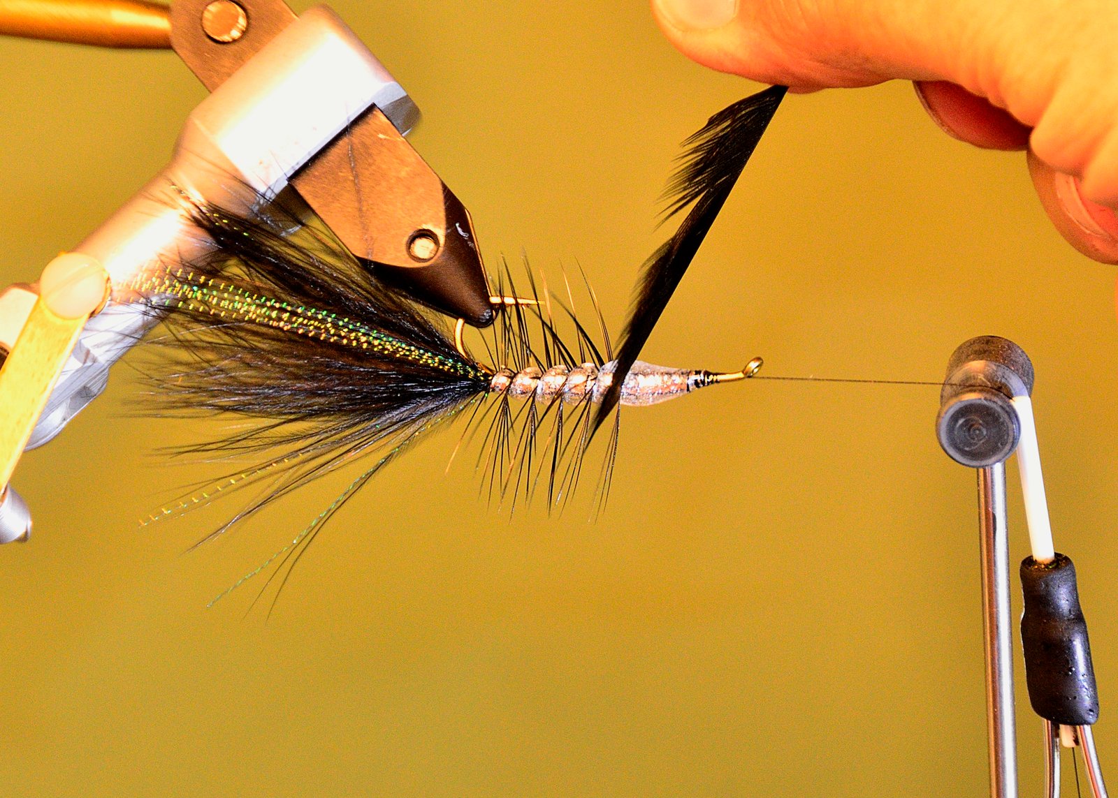 8 Al terminar de enroscar la pluma atarla rápidamente con tres o cuatro vueltas de hilo y continuar girando la mosca de atrás hacia delante hasta que el epoxi frague.