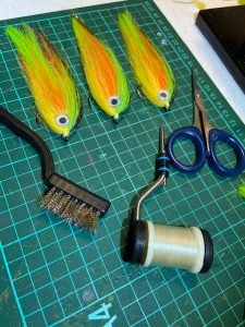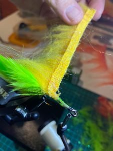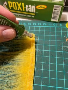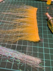 Dejamos que el adhesivo seque al contacto y colocamos a lo largo, en el mismo sentido que el craft fur, unas tiras de material que aporte brillo al entramado de fibras. Una opción es atar el craft fur al anzuelo y hacer este trabajo allí, esta técnica emplea Rubén Martin, pero yo encontré mucho mas simple, cómodo y rápido preparar las tiras sobre el tablero y luego atar la serie de moscas.