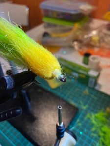 Consolidamos el lomo de la mosca colocando unas fibras de peacock sintético a modo de topping. Terminamos la mosca pegando a los lados ojos adhesivos, y prolijamos la cabeza modelando a tijera, una vez cerrado el atado. Reforzamos la cabeza de la mosca con unas gotas de cianocrilato.