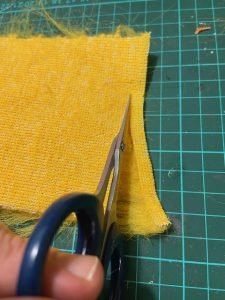 Tomamos un parche de craft fur y con cuidado de no dañar las fibras, cortamos una delgada tira del material (5 mm) a través de la orientación del peinado de la fibra.