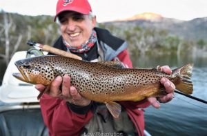 No habrían pasado más de 20 minutos cuando Esteban me indicó que un buen ejemplar estaba ingresando de la profundidad al playón. Tomamos un rumbo casi paralelo con el objetivo de acercarnos lentamente al pez. Cuando nos pusimos a tiro me indicó que lance. Hice un gran esfuerzo por serenarme y castear muy suavemente para no golpear el agua. La mosca llegó bien de manera que la trucha no se espantó, pero pasó lentamente junto al engaño ignorándolo por completo. Volví a castear y esta vez presenté el engaño a unos 3 metros por delante de la trucha. La vi acercarse lentamente y sin variar el ritmo pasó junto a la mosca. Pensé que la había perdido, y estaba a punto de levantar cuando escuché a Esteban que me decía que me mantuviese atento. El pez, repentinamente, cambió de rumbo y regresó directo a la mosca. Sentí fuertes latidos en el pecho y las sienes. A partir de ese momento la tensión y la atención de toda la tripulación estaba puesta en el indicador de pique. Lo único que miraba era esa mosca que flotaba mansamente sobre el agua. De golpe comenzó a desplazarse y hundirse lentamente. El grito de… ¡clavala! cortó el aire, al tiempo que afirmaba el pique. Apenas comenzó la corrida sentí que del otro lado de la línea estaba lo que a la postre sería mi récord de trucha arco iris: un hermoso macho de 73 cm. La alegría de haberla vencido sólo puede compararse con la emoción y el agradecimiento al verla alejarse lentamente hacia la seguridad de la profundidad de la laguna.